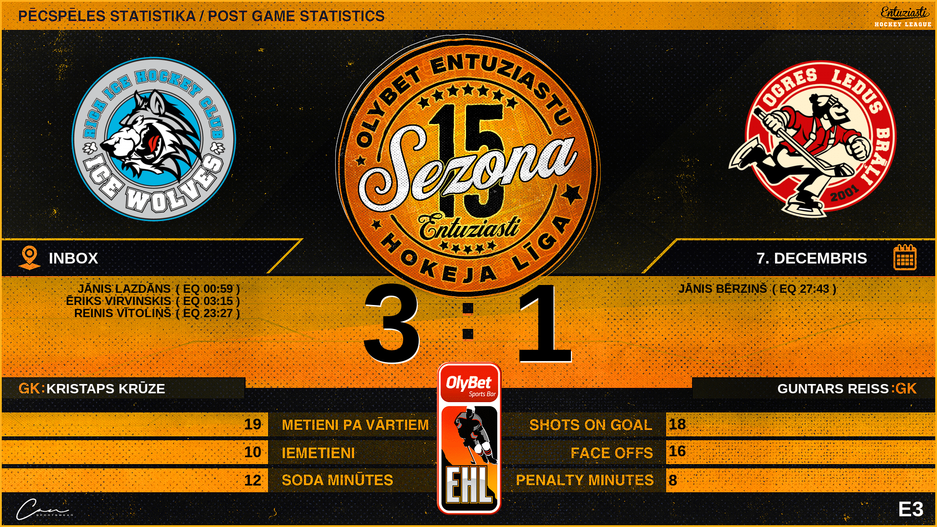 | 03:15 | WLF | Vārti (EQ) | #28 Ēriks Virvinskis, piespēles: #29 Jānis Lazdāns, #19 Reinis Vītoliņš |