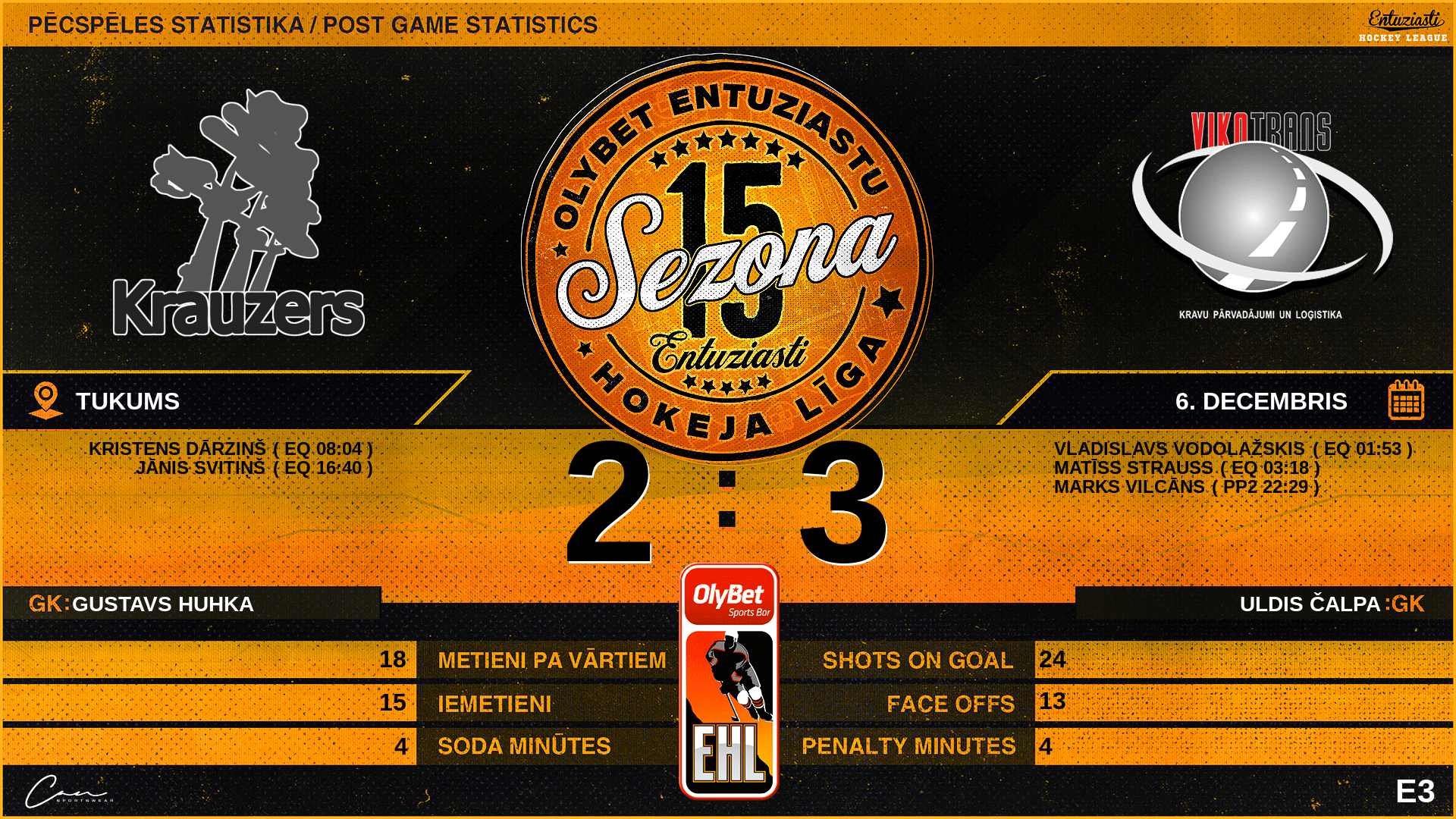 | 03:18 | VKT | Vārti (EQ) | #11 Matīss Strauss, piespēles: #88 Artūrs Klimkāns, #69 Lenards Roze |