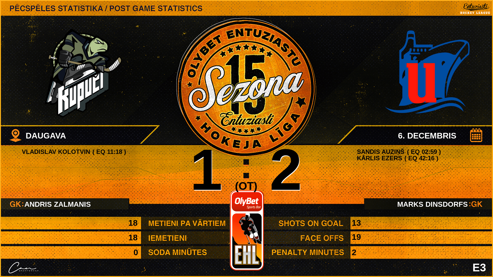 | 42:16 | UNI | Vārti (EQ) | #77 Kārlis Ezers, piespēles: #87 Kristers Gura, #19 Rainers Meikšāns |