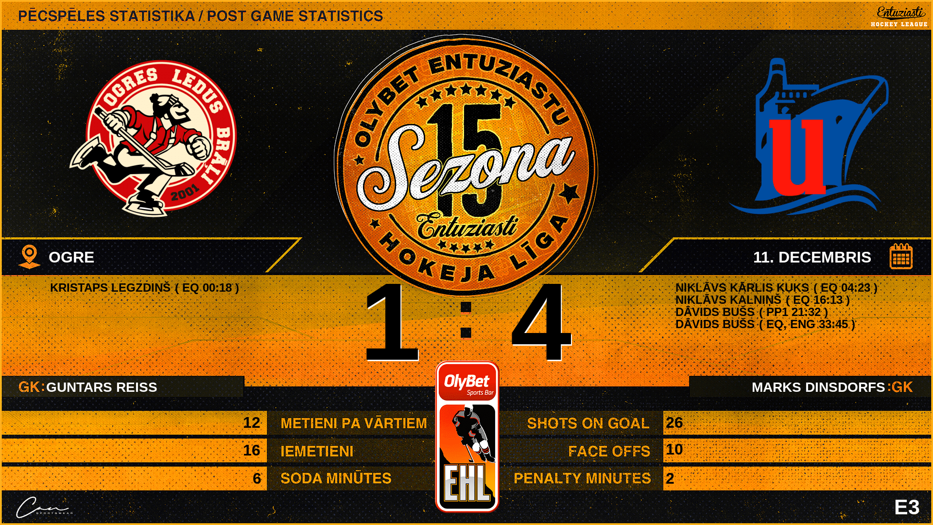 | 33:45 | UNI | Vārti (EQ, ENG) | #69 Dāvids Bušs, piespēles: #21 Andris Gabrāns |