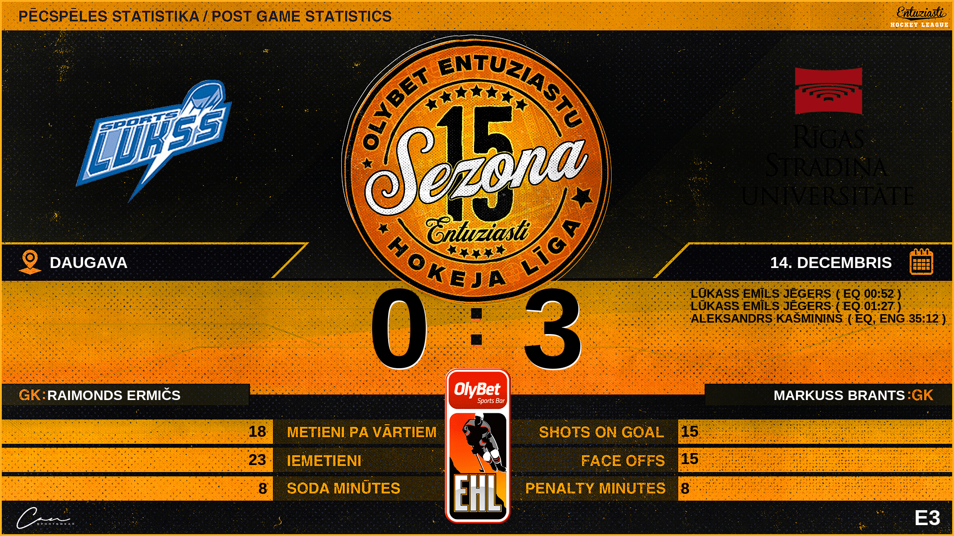| 00:52 | RSU | Vārti (EQ) | #56 Lūkass Emīls Jēgers, piespēles: #72 Patrik Anton Harju, #15 Mikael Rauvola |