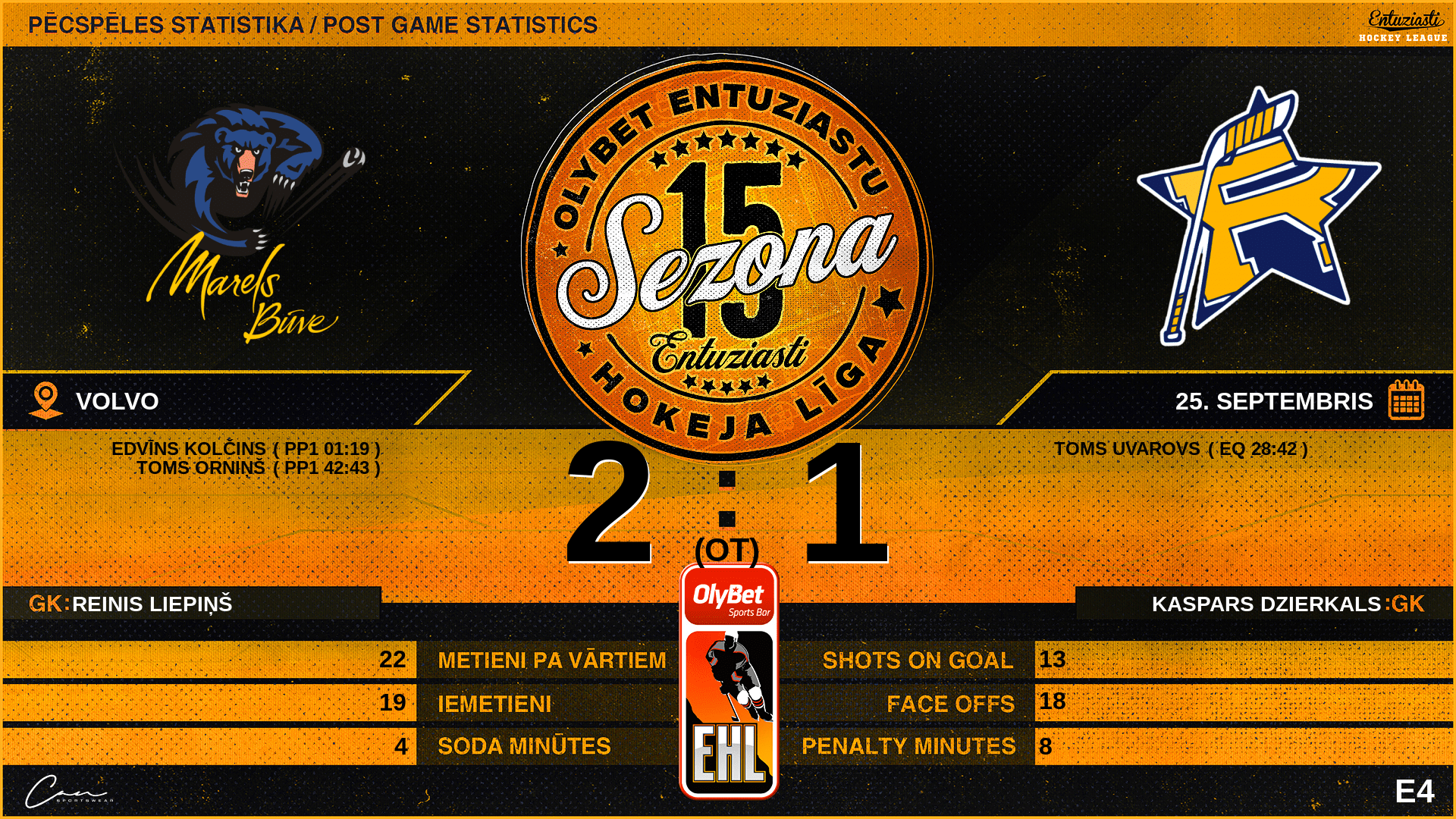 01:19 | MB2 | Vārti (PP1) | #27 Edvīns Kolčins, piespēles: #97 Patriks Audze, #92 Toms Orniņš |