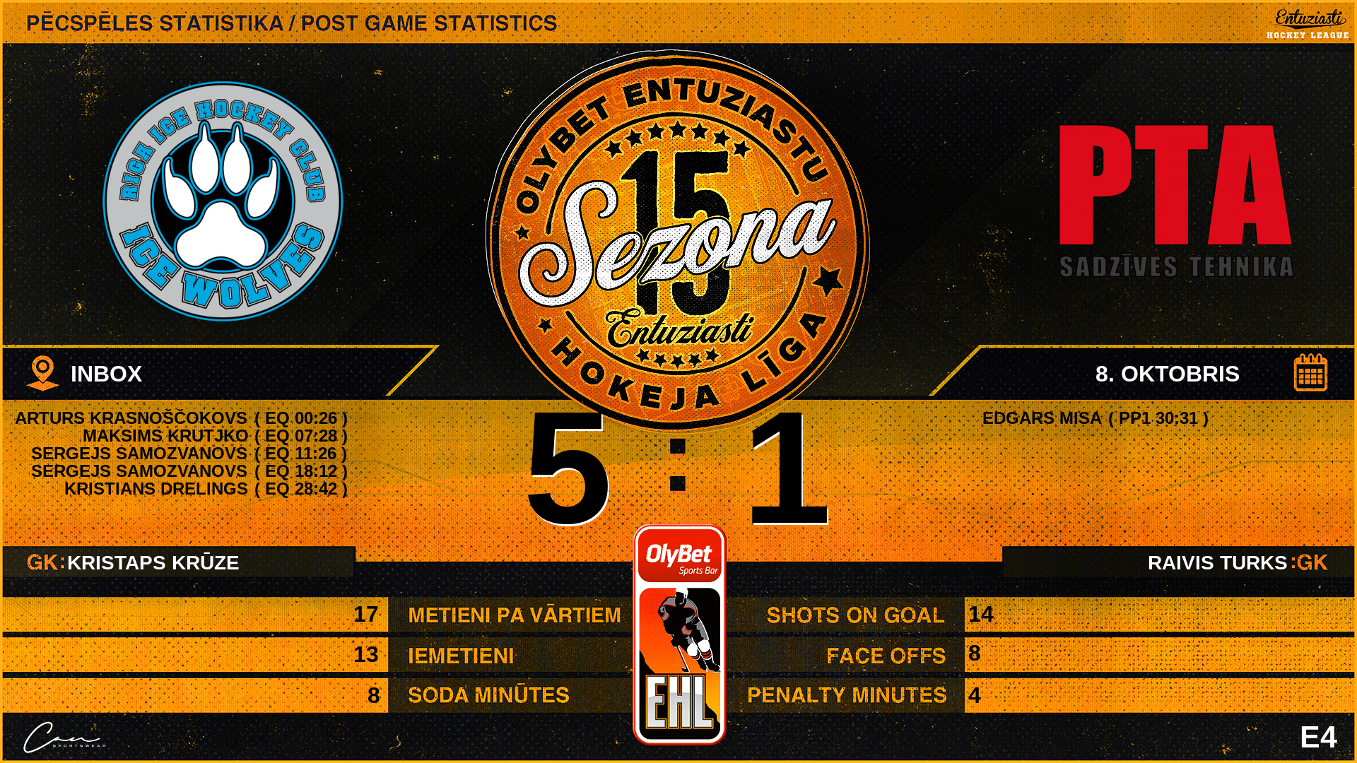 | 30:31 | PTA | Vārti (PP1) | #26 Edgars Misa, piespēles: #11 Ingus Strautmanis, #24 Matīss Egle |