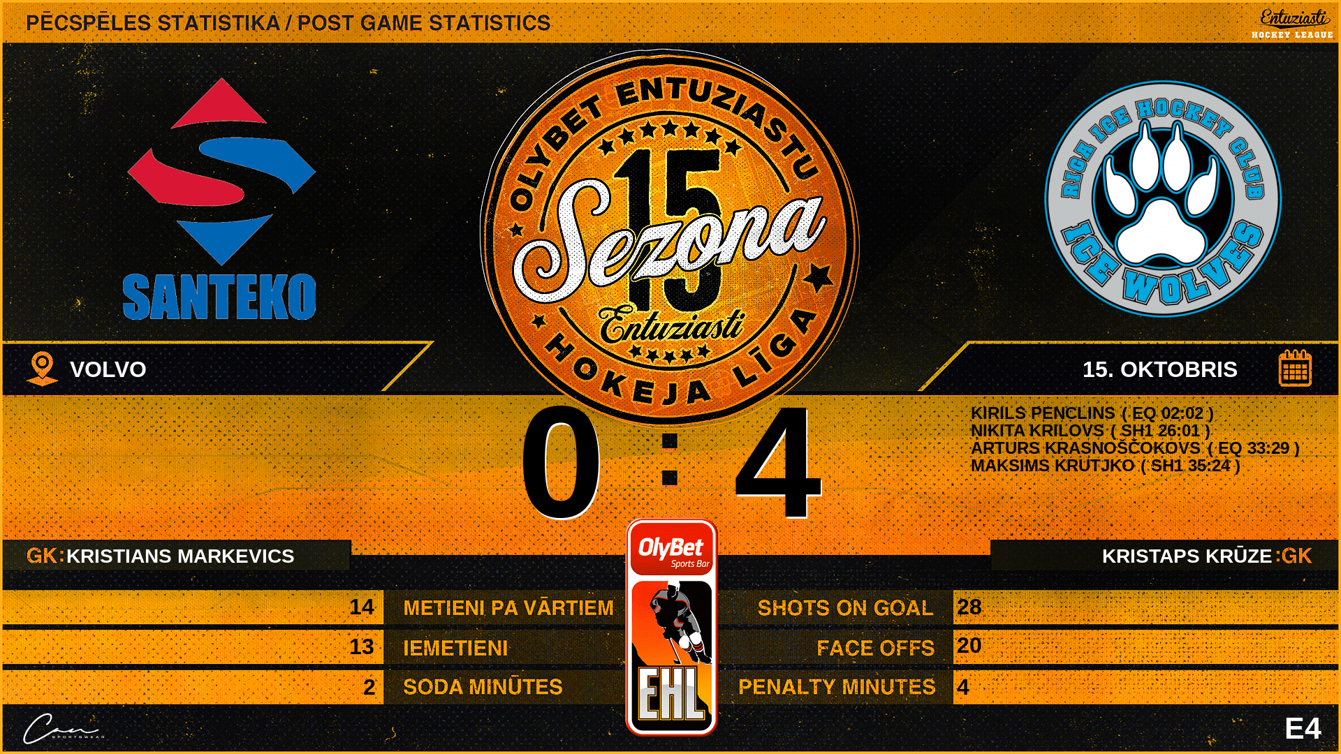 | 33:29 | WF2 | Vārti (EQ) | #42 Arturs Krasnoščokovs, piespēles: #14 Kristians Drelings, #39 Aleksandrs Sokolovs |