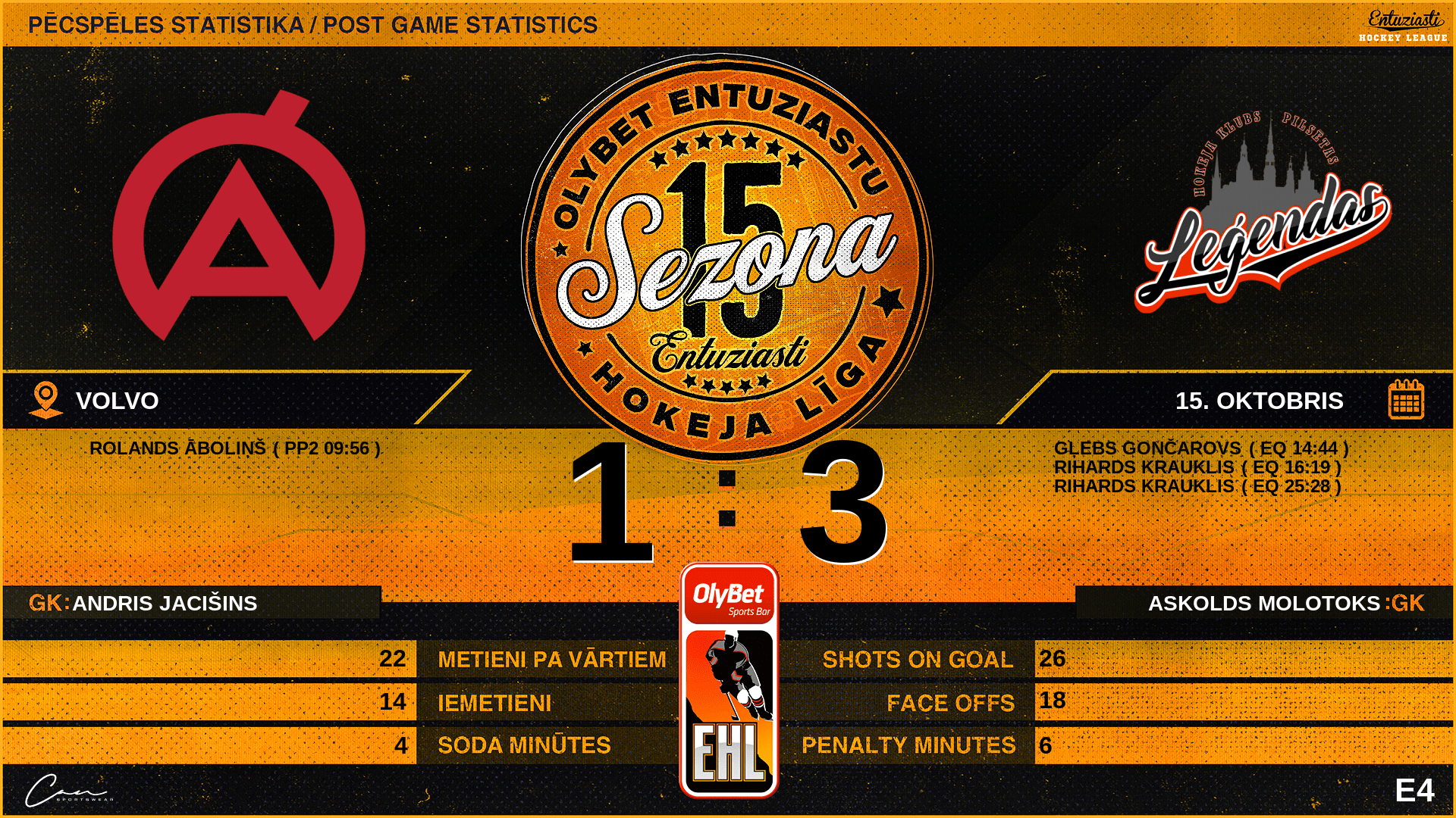 | 25:28 | PLG | Vārti (EQ) | #90 Rihards Krauklis, piespēles: #85 Ģirts Kalniņš |