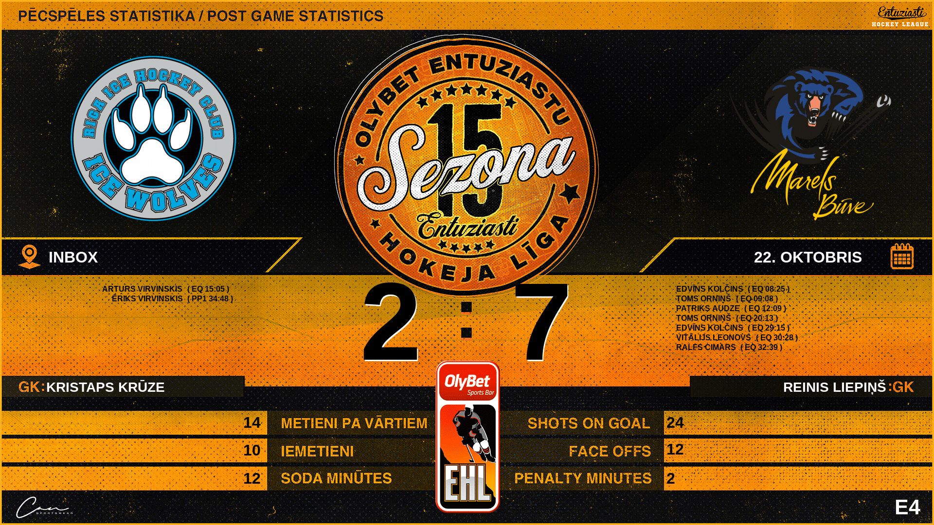 | 15:05 | WF2 | Vārti (EQ) | #16 Arturs Virvinskis, piespēles: #97 Rojs Skrebels, #42 Arturs Krasnoščokovs |