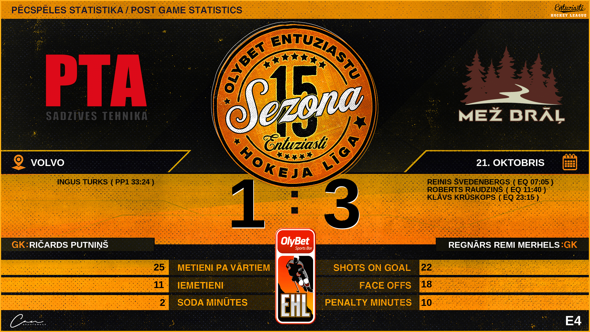 | 33:24 | PTA | Vārti (PP1) | #88 Ingus Turks, piespēles: #29 Patriks Flaksis, #62 Mārtiņš Beinarovičs |