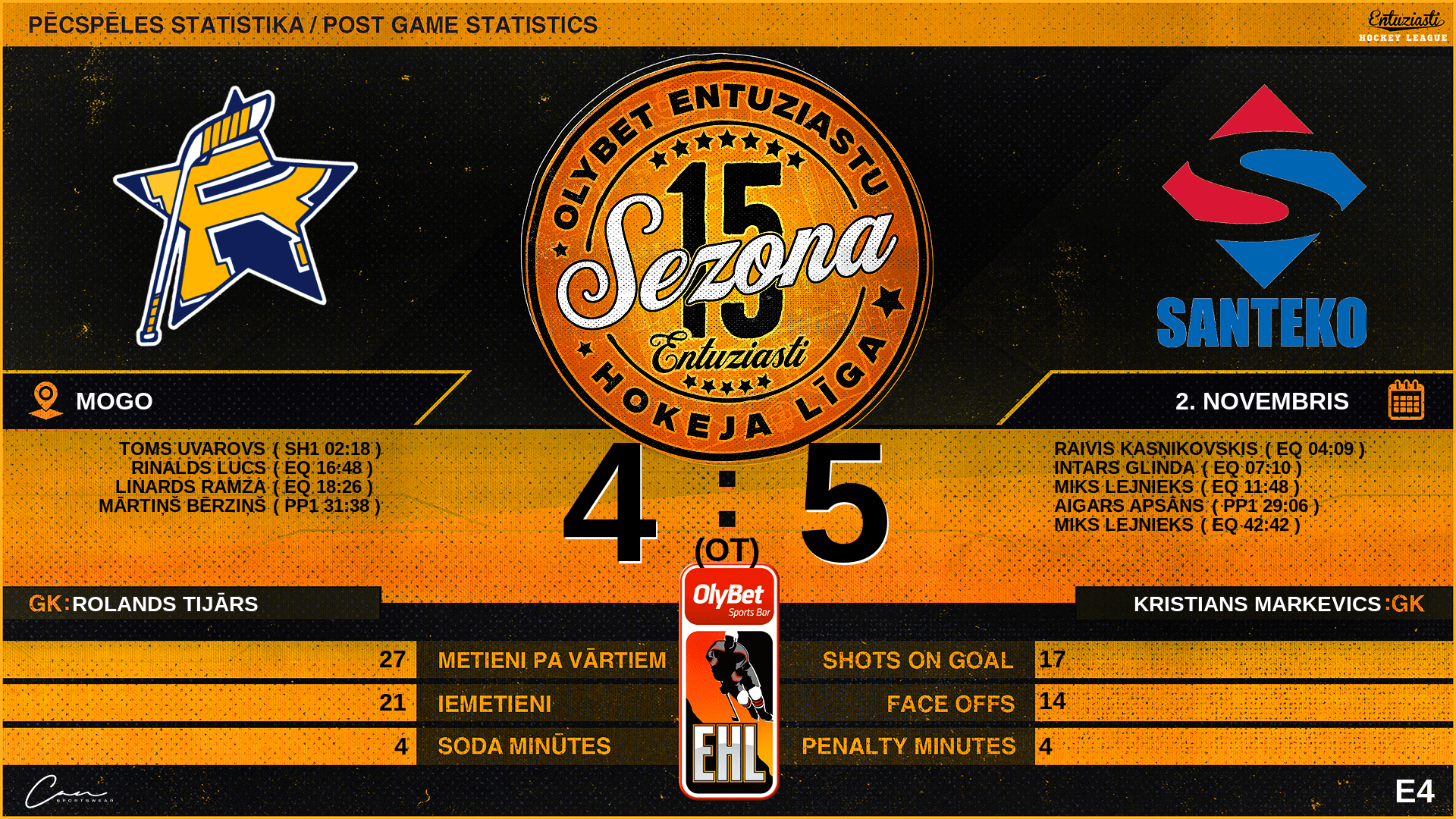 | 42:42 | SAN | Vārti (EQ) | #17 Miks Lejnieks, piespēles: #26 Antons Babuškins, #89 Andžs Pickainis |
