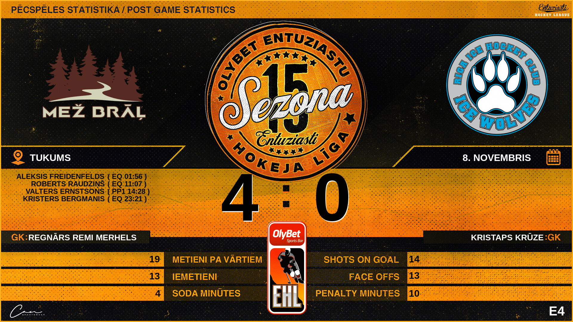| 11:07 | MZB | Vārti (EQ) | #10 Roberts Raudziņš, piespēles: #28 Kaspars Rudzītis, #71 Kristers Bergmanis |