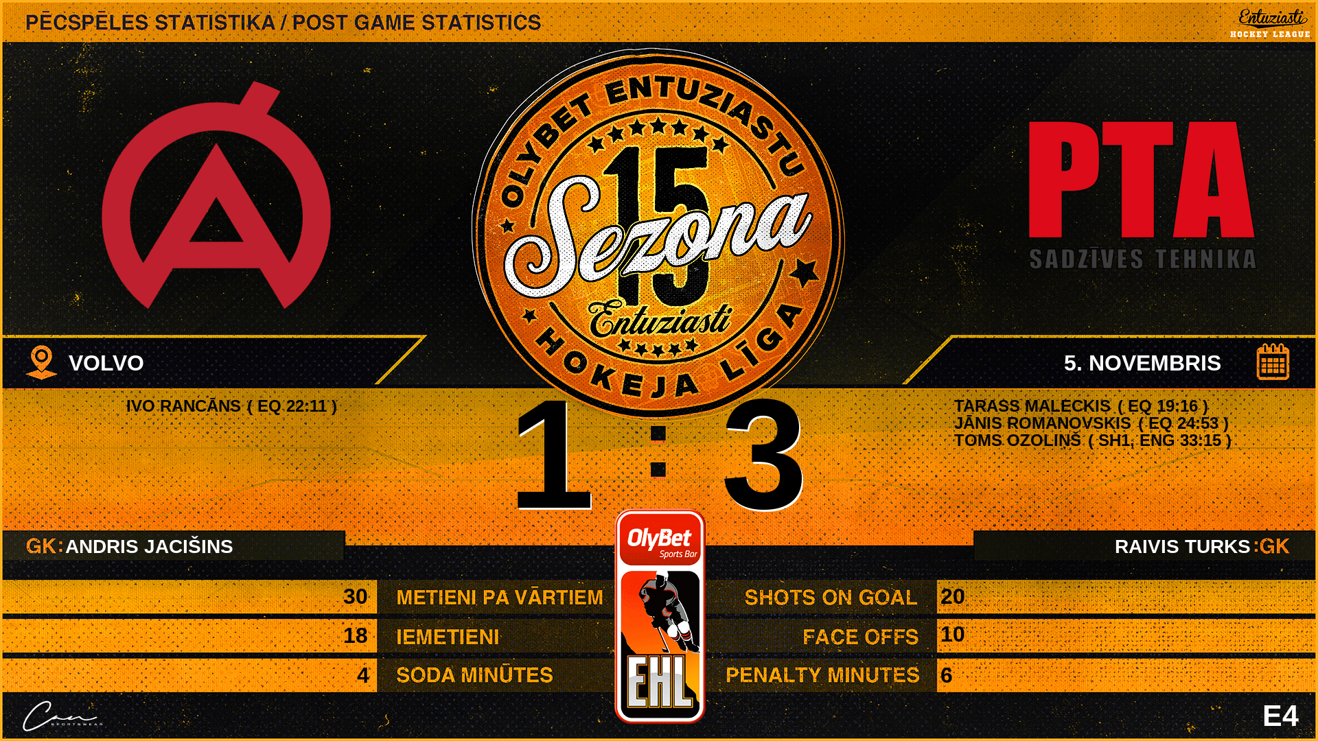 | 24:53 | PTA | Vārti (EQ) | #10 Jānis Romanovskis, piespēles: #89 Ģirts Blumbergs, #29 Patriks Flaksis |