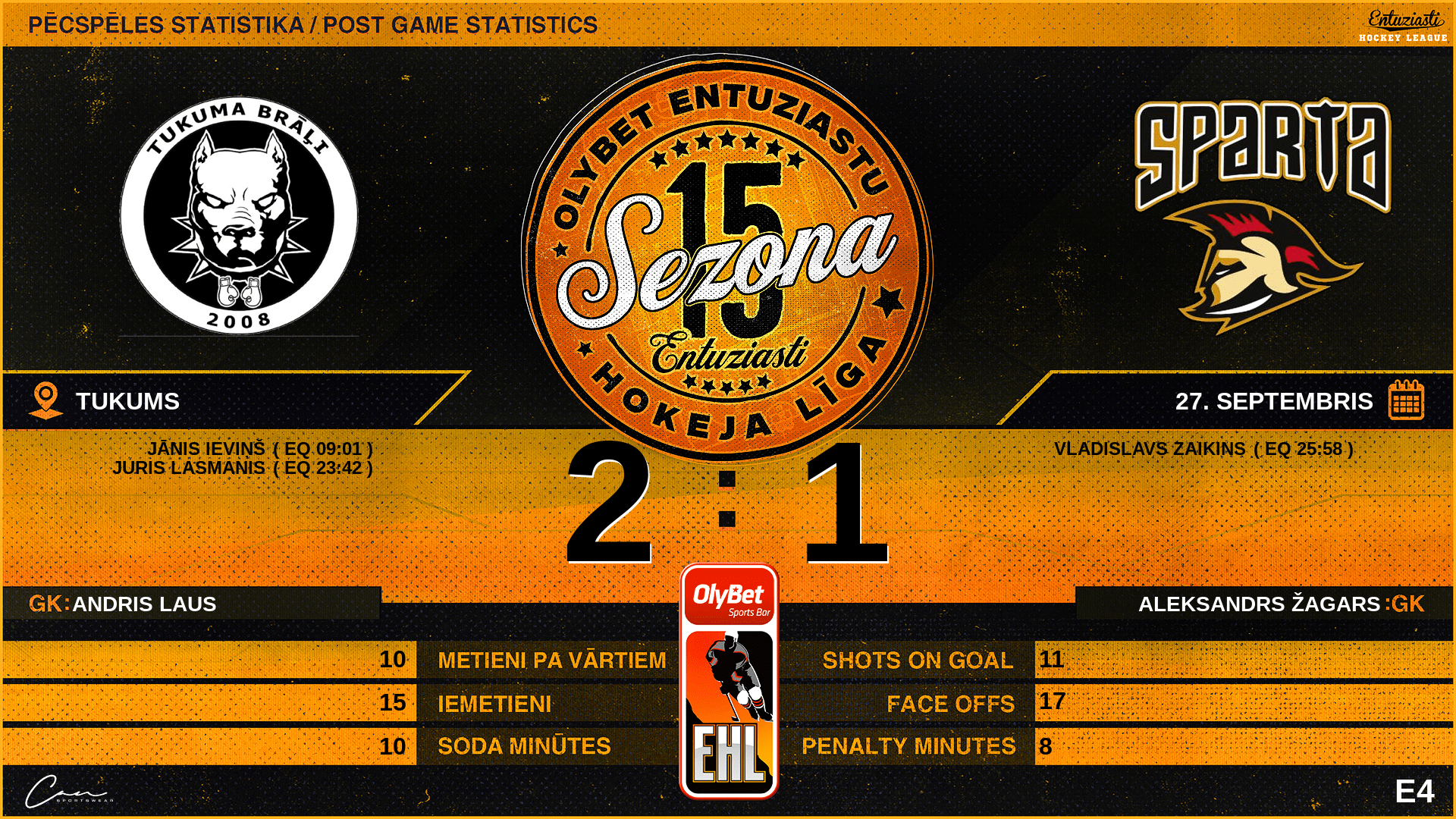 23:42 | TB2 | Vārti (EQ) | #83 Juris Lasmanis, piespēles: #46 Jānis Ieviņš, #11 Andis Dūniņš |