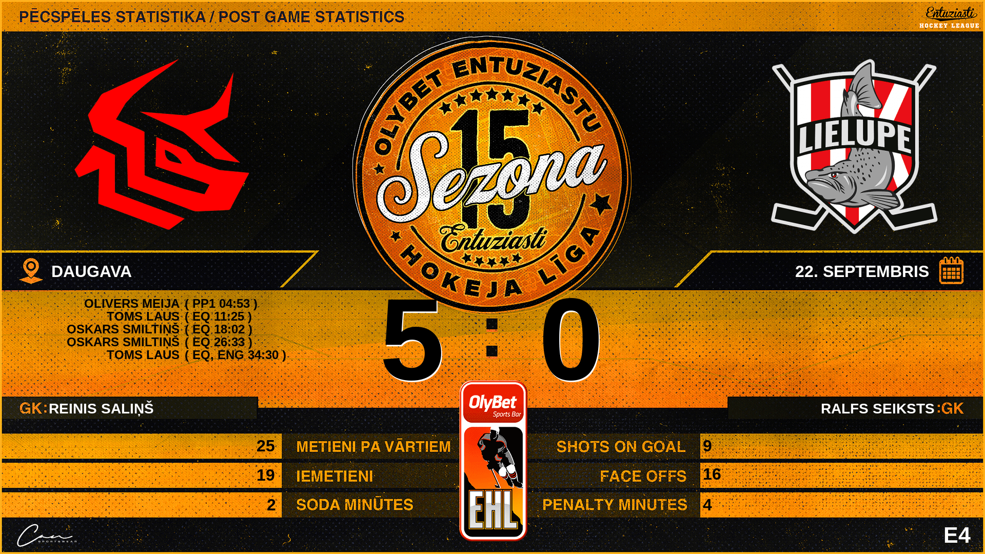 18:02 | TRS | Vārti (EQ) | #86 Oskars Smiltiņš, piespēles: #68 Toms Laus, #50 Roberts Ernests Goldmanis |