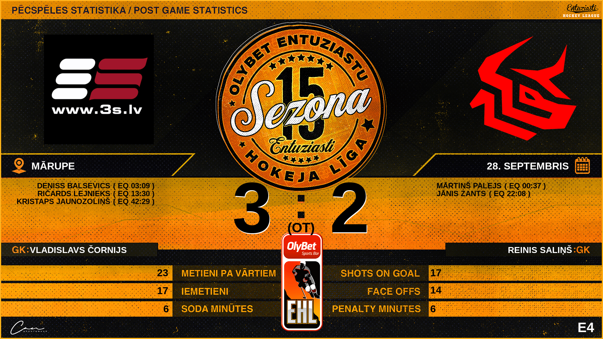 03:09 | 3S | Vārti (EQ) | #8 Deņiss Balsevics, piespēles: #11 Kristaps Jaunozoliņš |