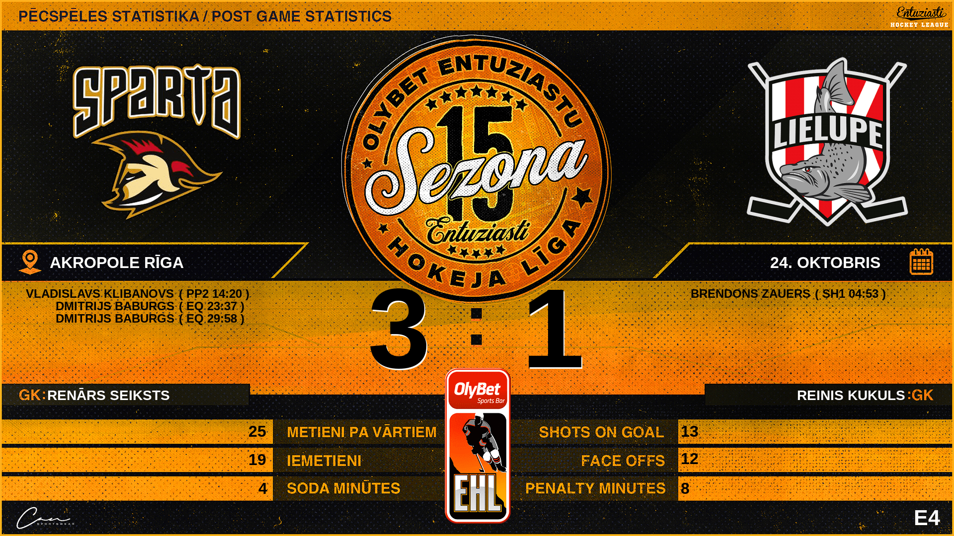 | 29:58 | SPR | Vārti (EQ) | #88 Dmitrijs Baburgs, piespēles: #18 Mārtiņš Gerke, #85 Pauls Kristens Neijs |