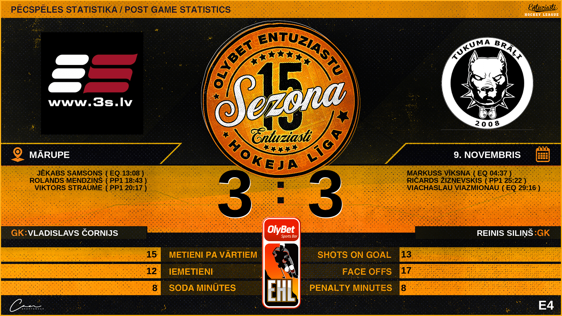 | 29:16 | TB2 | Vārti (EQ) | #55 Viachaslau Viazmionau, piespēles: #2 Markuss Vīksna |