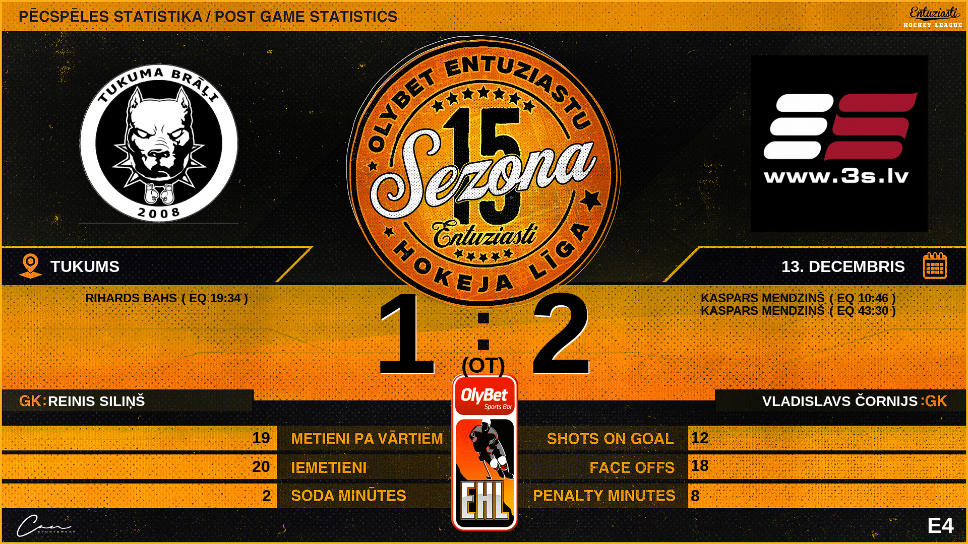 | 10:46 | 3S | Vārti (EQ) | #64 Kaspars Mendziņš, piespēles: #87 Ričards Lejnieks |