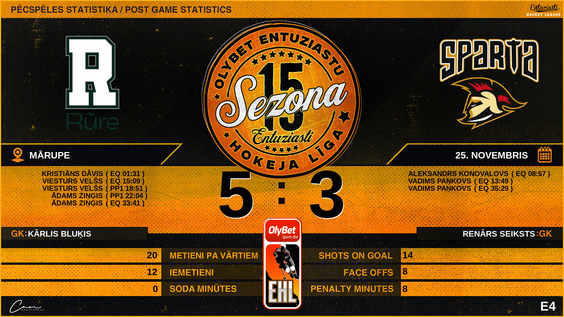 | 33:41 | RUR | Vārti (EQ) | #88 Ādams Ziņģis, piespēles: #6 Viesturs Morozs, #87 Kārlis Baumanis |