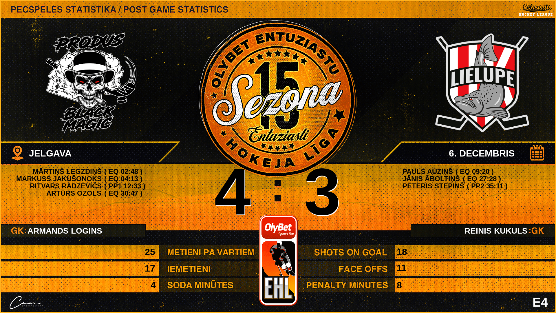 | 04:13 | BMK | Vārti (EQ) | #71 Markuss Jakušonoks, piespēles: #21 Daniels Šeršņovs, #88 Rolands Lagzdiņš |