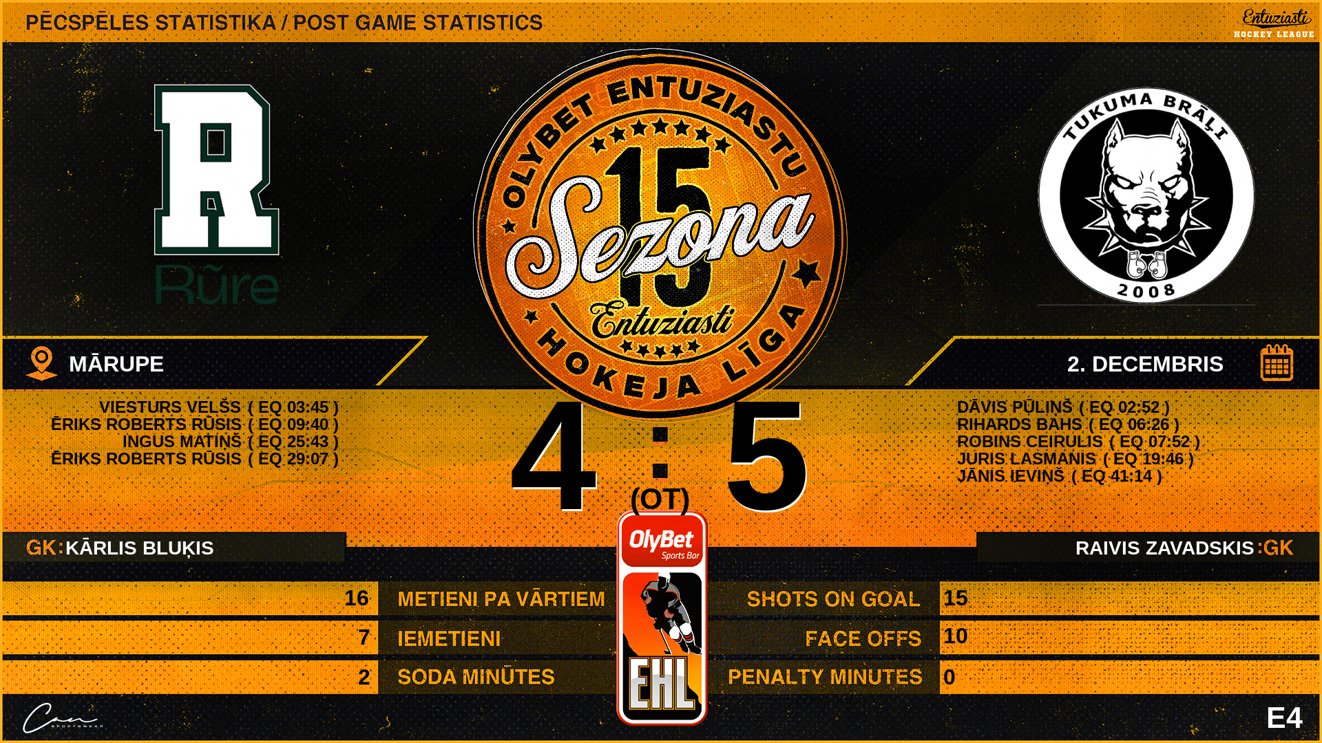 | 25:43 | RUR | Vārti (EQ) | #9 Ingus Matiņš, piespēles: #83 Raivo Niks Baltrums, #17 Jēkabs Leiškalns |