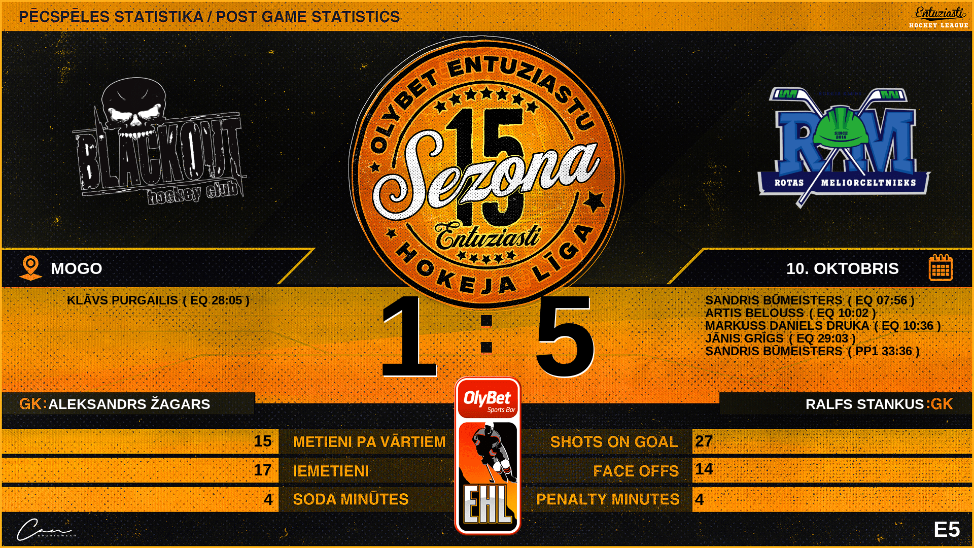 | 33:36 | RTS | Vārti (PP1) | #92 Sandris Būmeisters, piespēles: #81 Kaspars Jansons, #5 Rojs Pinnis |