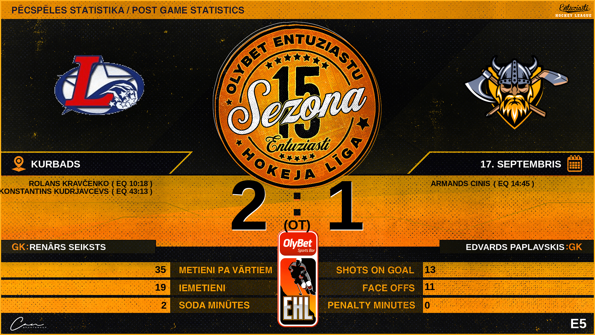 10:18 | LA2 | Vārti (EQ) | #44 Rolans Kravčenko, piespēles: #28 Sergejs Volvenkins, #84 Igors Porohs |