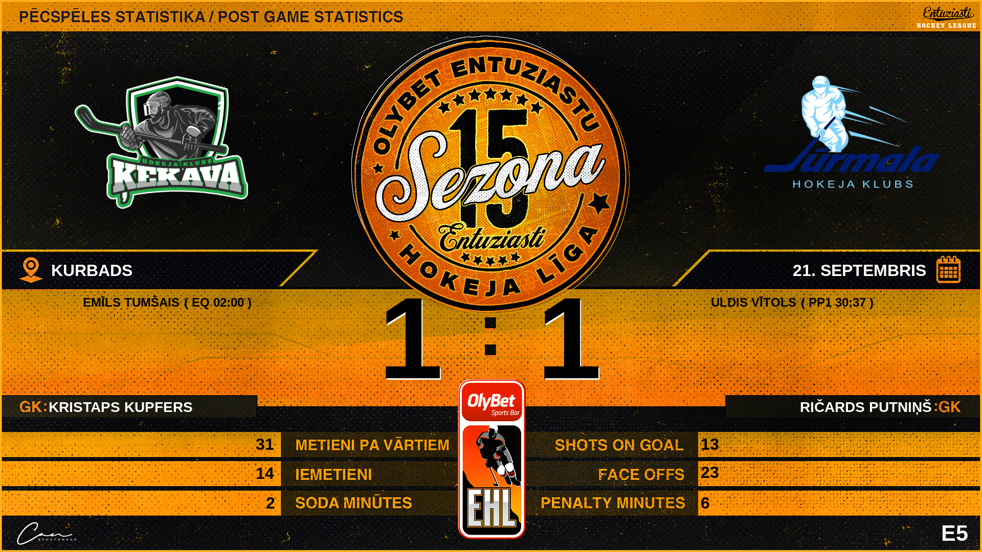 02:00 | ĶK1 | Vārti (EQ) | #9 Emīls Tumšais, piespēles: #16 Trevor Scotti |