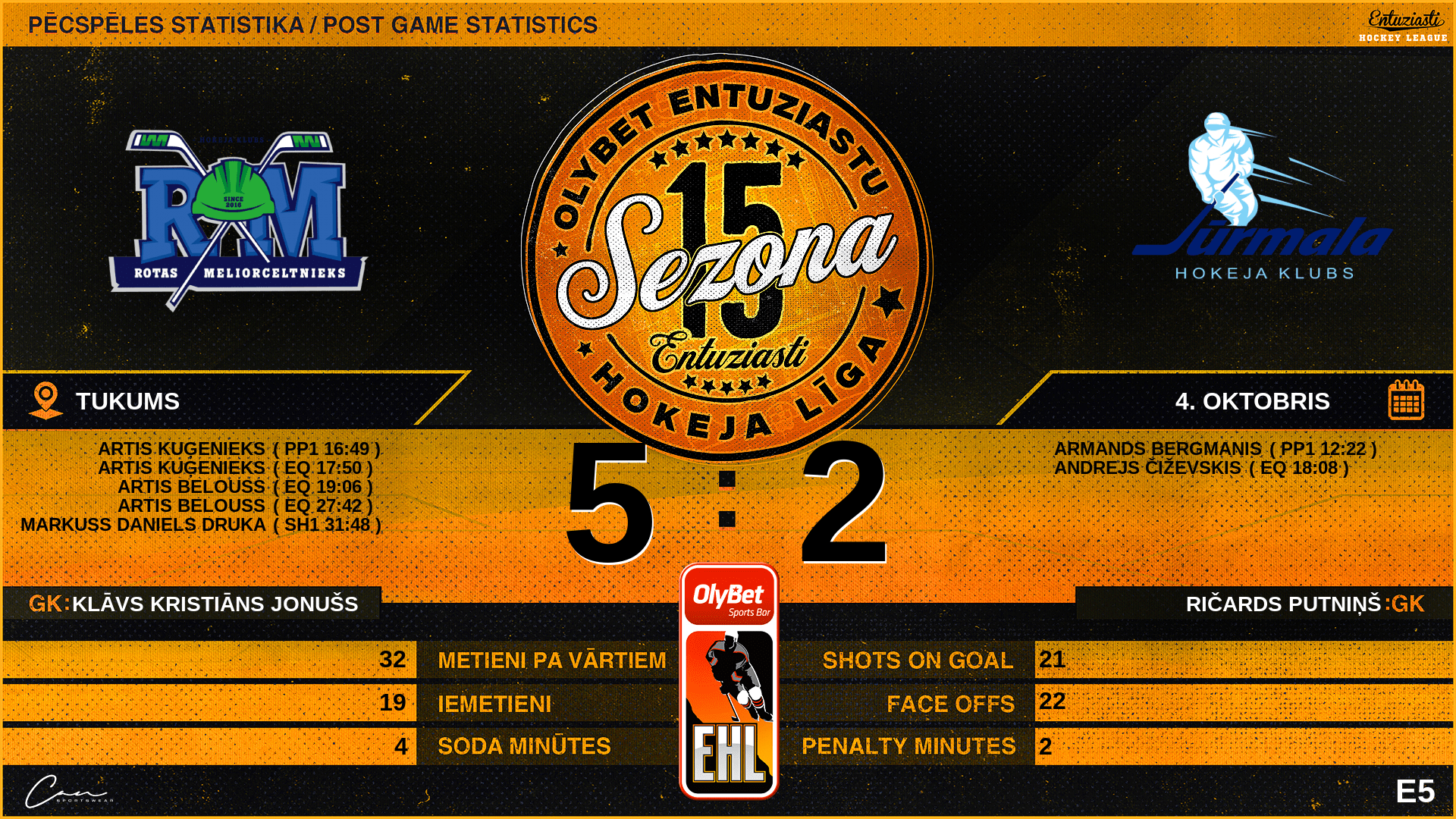 17:50 | RTS | Vārti (EQ) | #54 Artis Kuģenieks, piespēles: #5 Rojs Pinnis |