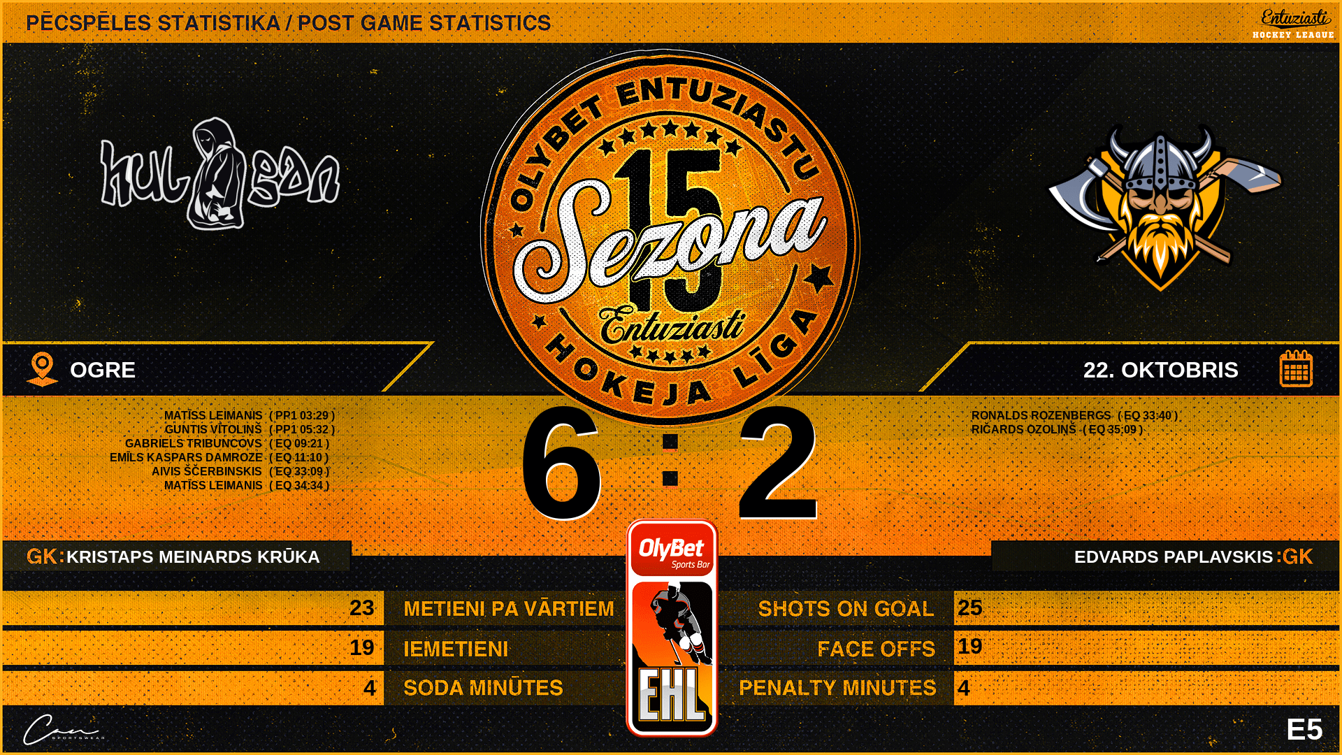 | 09:21 | HLG | Vārti (EQ) | #18 Gabriels Tribuncovs, piespēles: #89 Emīls Kaspars Damroze |