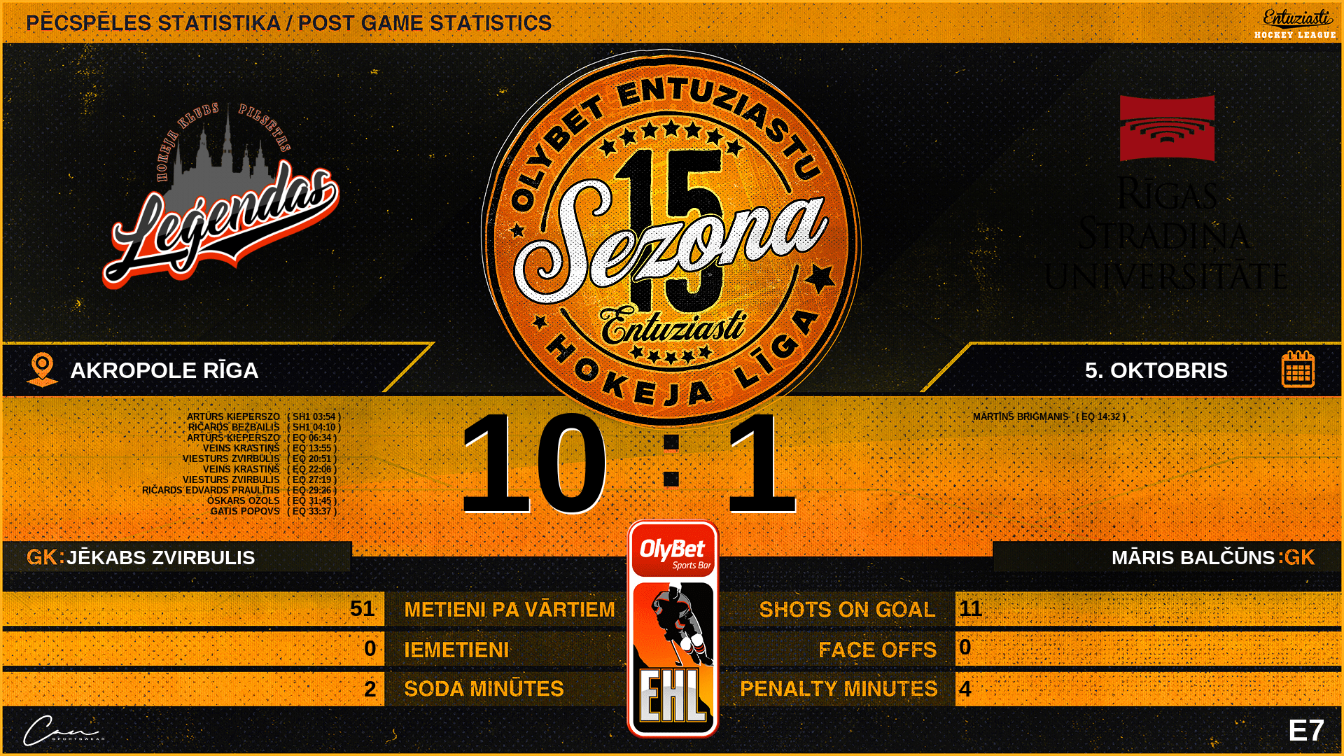 20:51 | PL7 | Vārti (EQ) | #4 Viesturs Zvirbulis, piespēles: #17 Juris Lopatko, #31 Deņiss Pērkons |