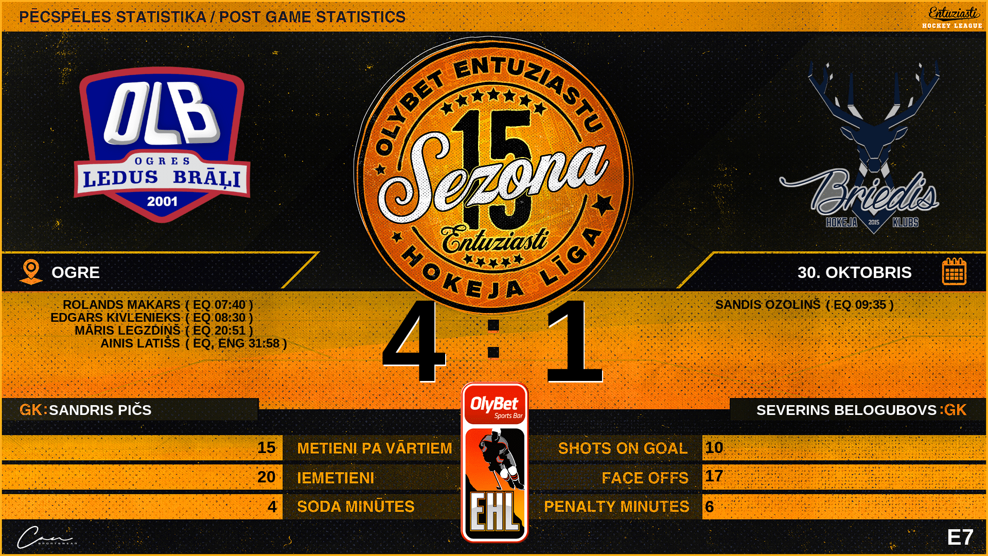 | 20:51 | OL2 | Vārti (EQ) | #69 Māris Legzdiņš, piespēles: #7 Roberts Jevsejevs |