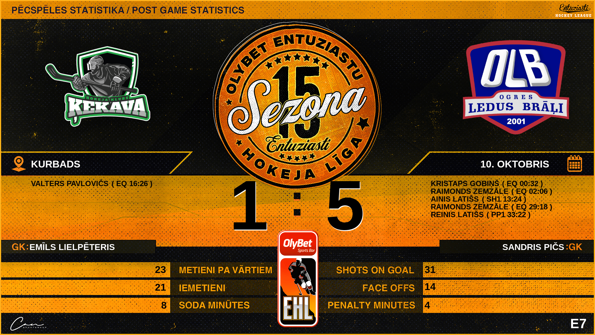 | 00:32 | OL2 | Vārti (EQ) | #30 Kristaps Gobiņš, piespēles: #7 Roberts Jevsejevs |