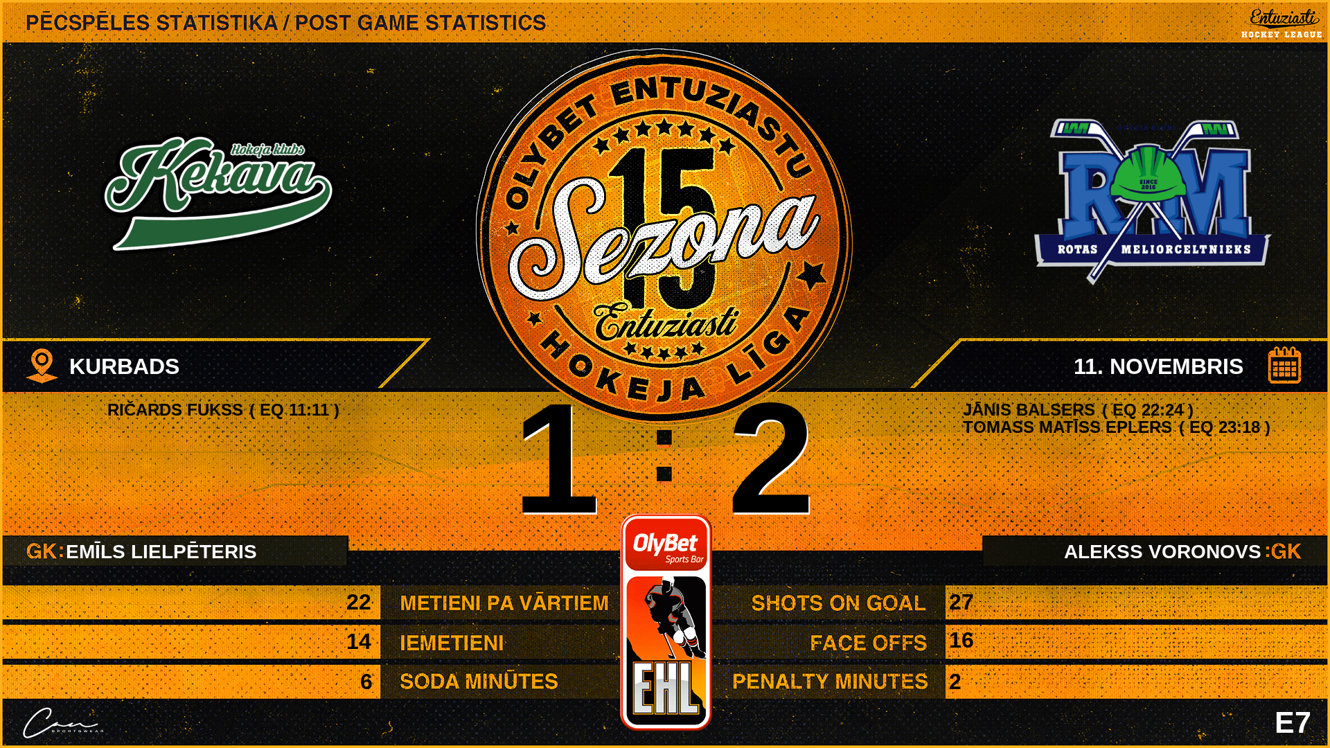 | 11:11 | ĶE3 | Vārti (EQ) | #69 Ričards Fukss, piespēles: #80 Niklāvs Romanovskis, #68 Krists Miksons |