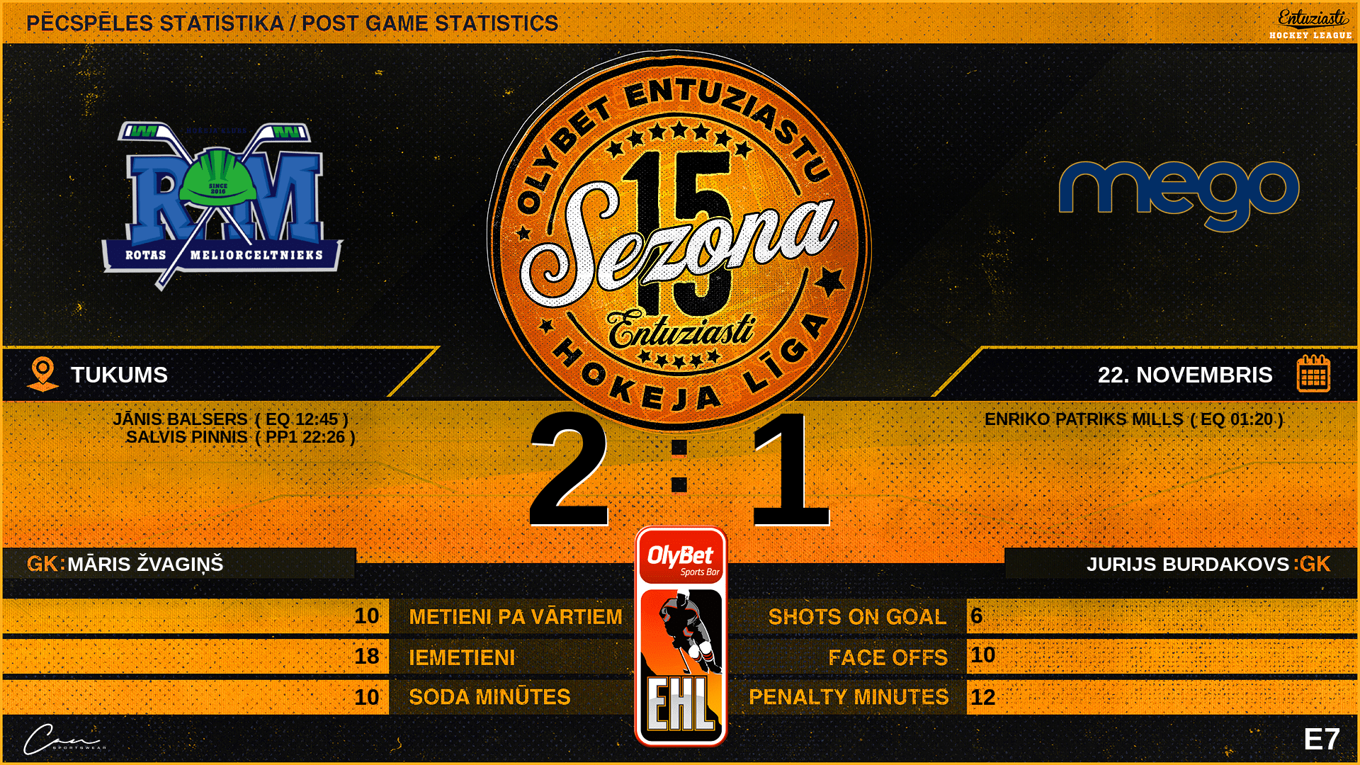 | 01:20 | MGO | Vārti (EQ) | #77 Enriko Patriks Mills, piespēles: #55 Mihails Vaitjuļevičs |