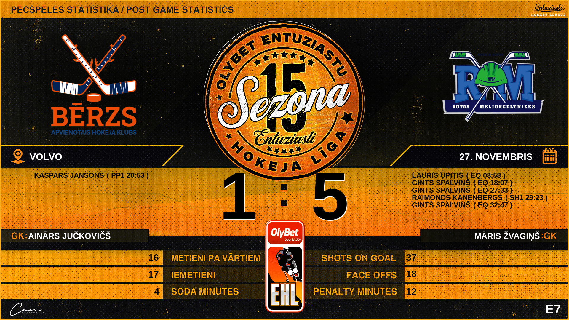 | 18:07 | RT2 | Vārti (EQ) | #94 Gints Spalviņš, piespēles: #99 Tomass Matīss Eplers, #87 Jānis Balsers |