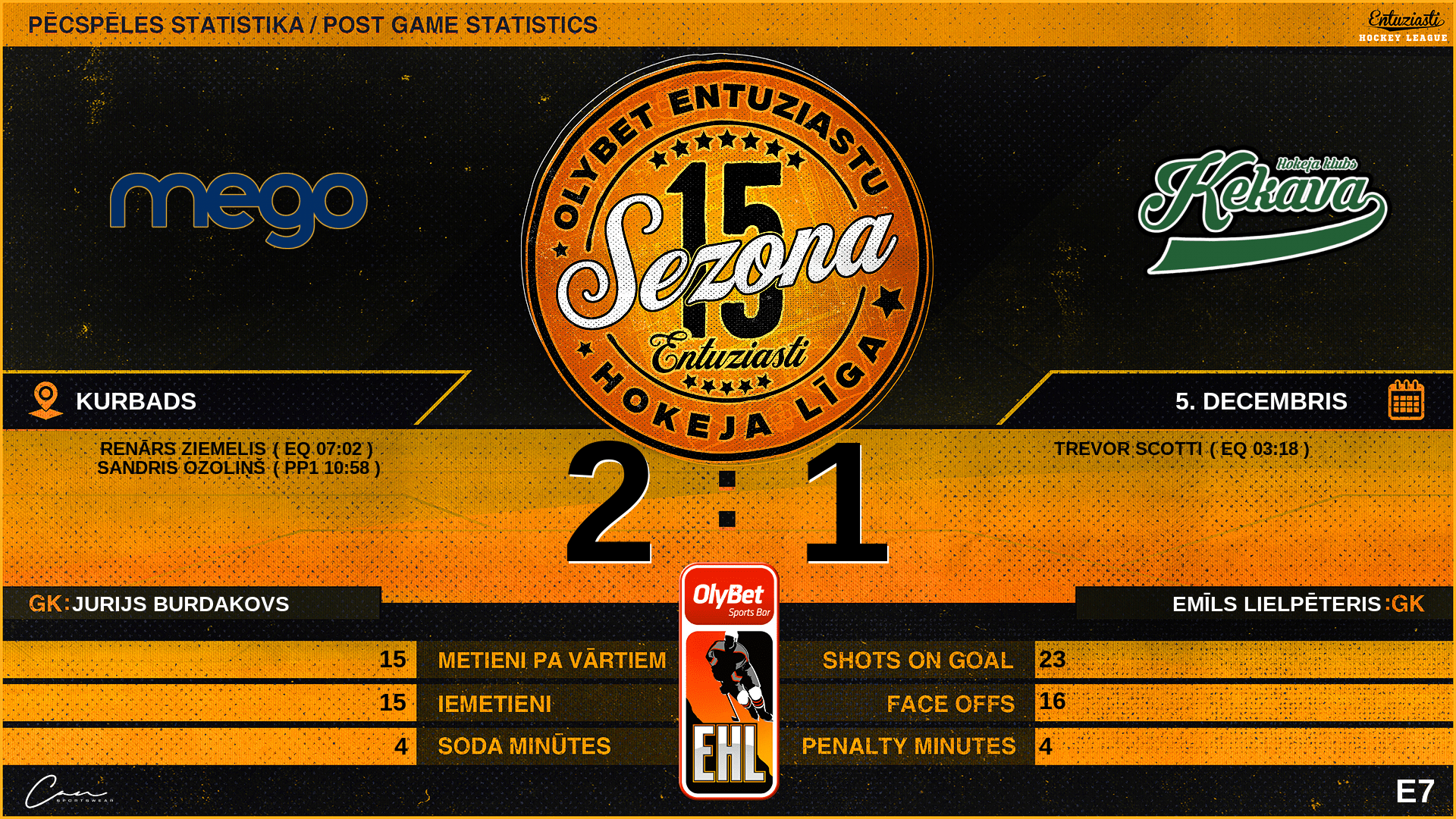 | 34:58 | ĶE3 | GK Out | #2 Emīls Lielpēteris |