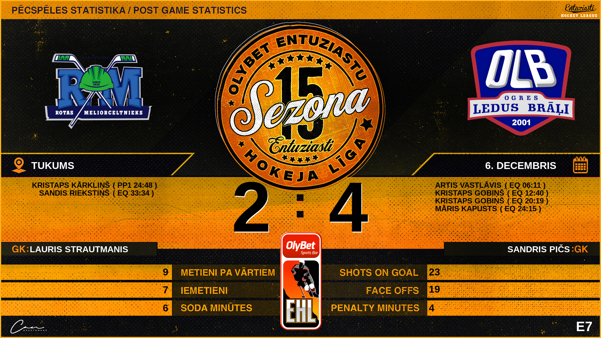 | 24:15 | OL2 | Vārti (EQ) | #24 Māris Kapusts, piespēles: #7 Kristaps Gobiņš, #42 Raimonds Zemzāle |