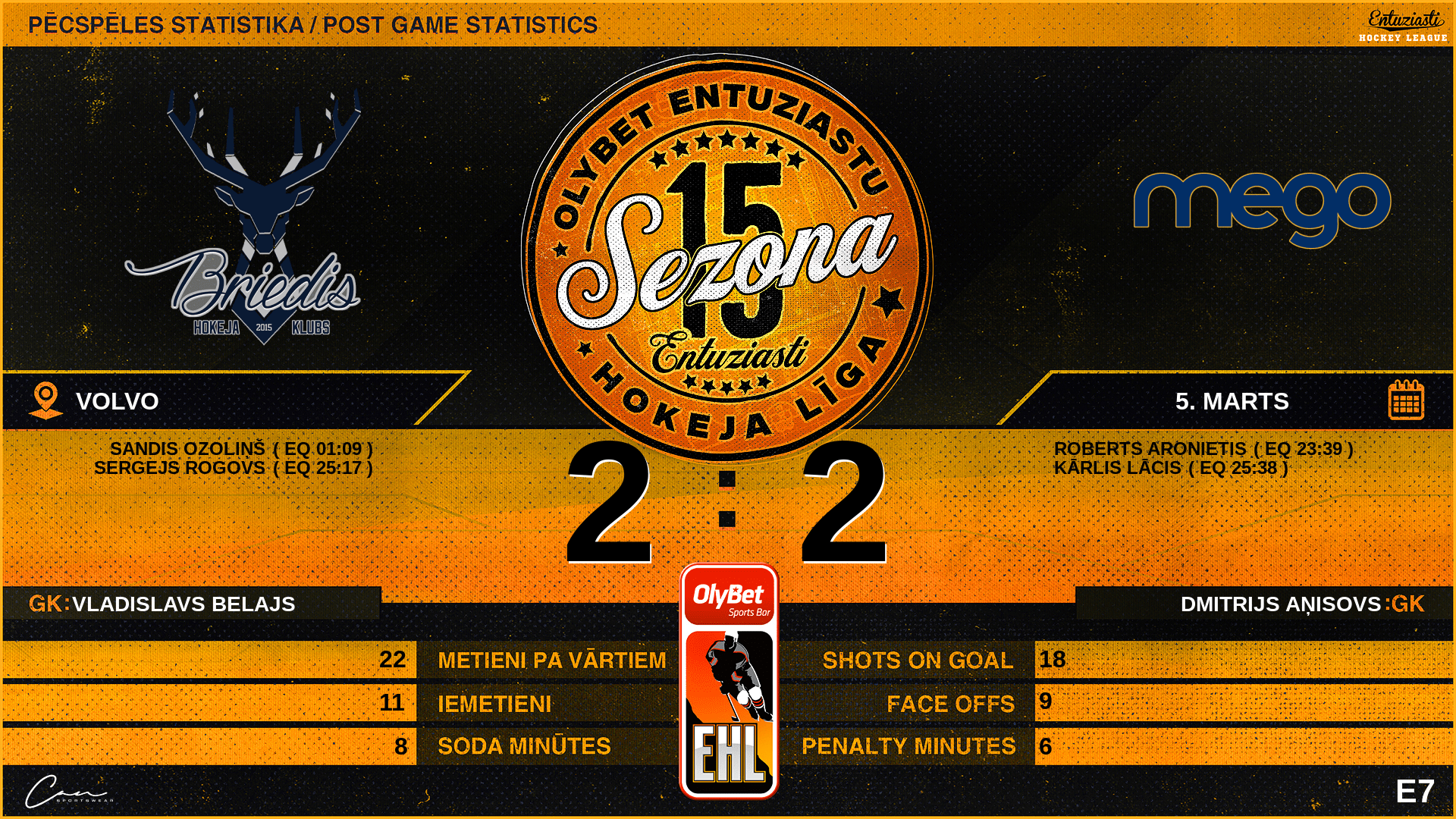 | 23:39 | MGO | Vārti (EQ) BRD 1 : 1 MGO | #12 Roberts Aronietis, piespēles: #76 Sandris Ozoliņš, #8 Kārlis Lācis |