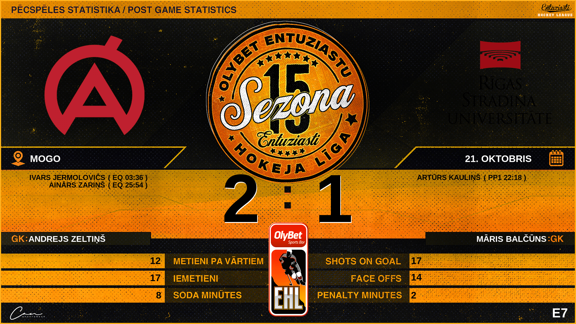 | 25:54 | ROA | Vārti (EQ) | #84 Ainārs Zariņš, piespēles: #33 Kaspars Grenevics, #16 Kārlis Roziņš |