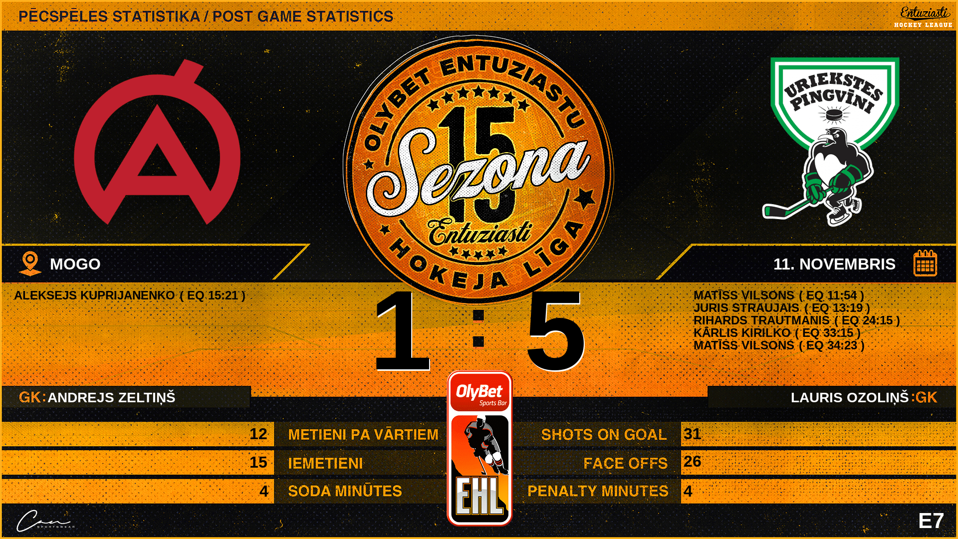 | 34:23 | UPG | Vārti (EQ) | #68 Matīss Vilsons, piespēles: #45 Viesturs Lielausis |