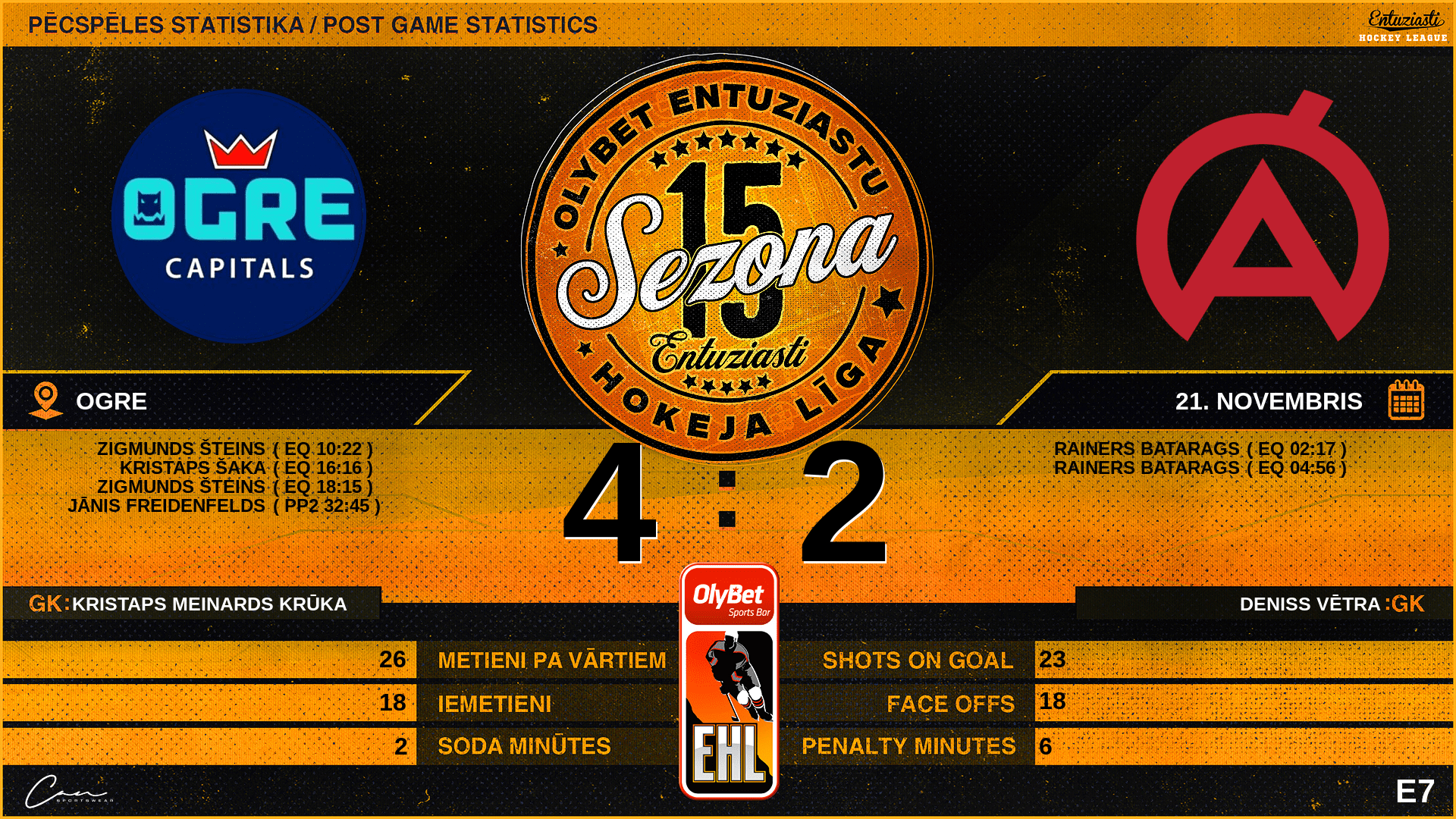 | 16:16 | OCP | Vārti (EQ) | #24 Kristaps Šaka, piespēles: #5 Rolands Mežapuķe |