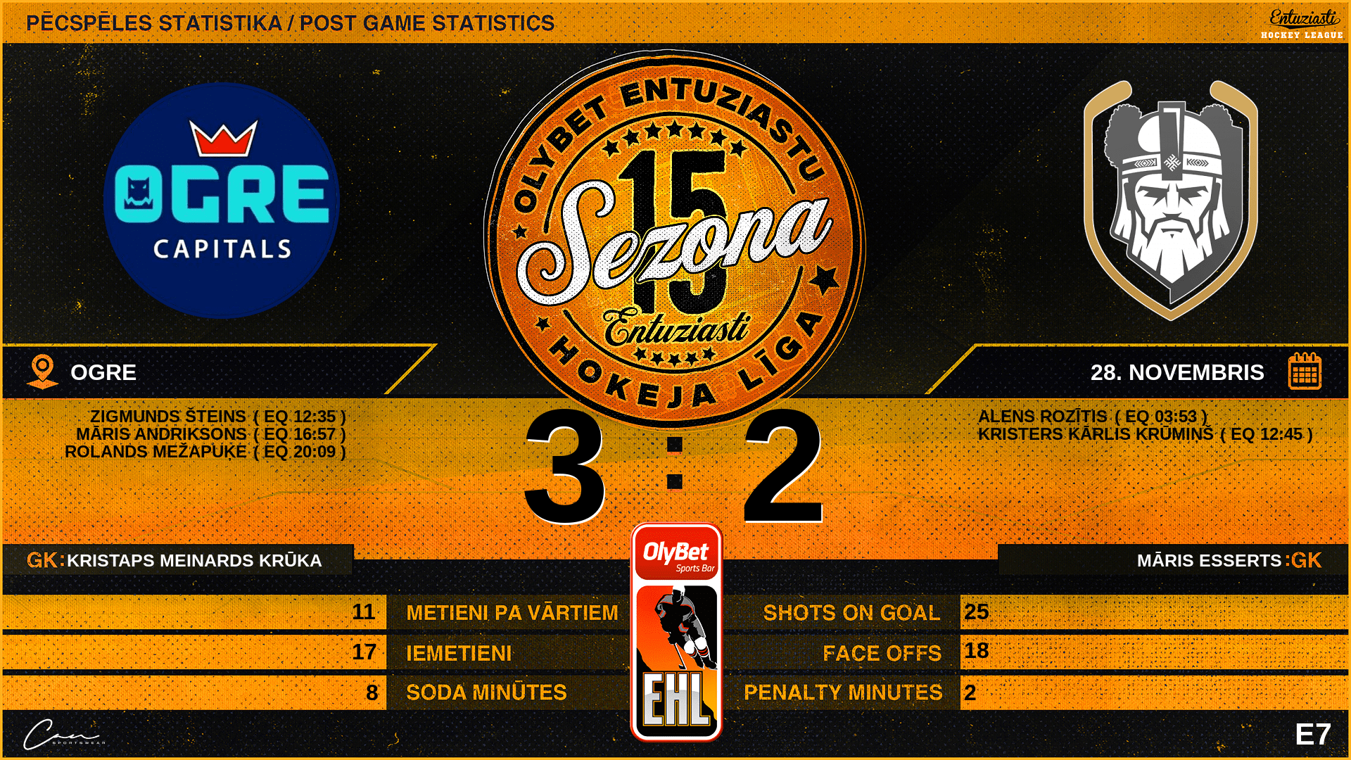 | 20:09 | OCP | Vārti (EQ) | #5 Rolands Mežapuķe, piespēles: #28 Zigmunds Šteins |