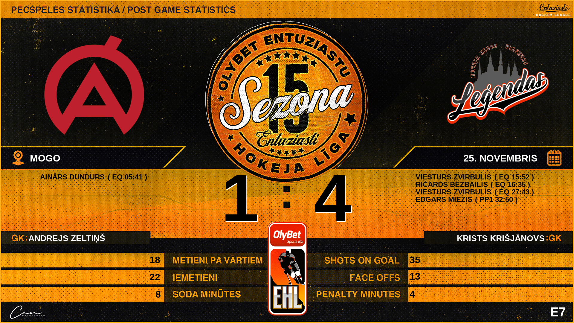 | 15:52 | PL7 | Vārti (EQ) | #4 Viesturs Zvirbulis, piespēles: #17 Juris Lopatko, #30 Ēriks Andžāns |
