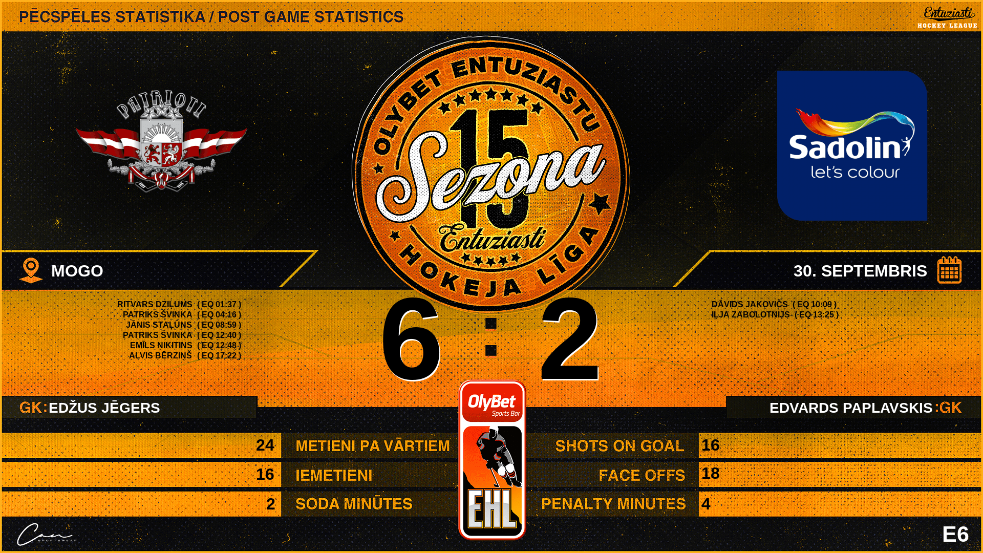13:25 | SDN | Vārti (EQ) | #89 Iļja Zabolotnijs, piespēles: #84 Mārtiņš Vilks |