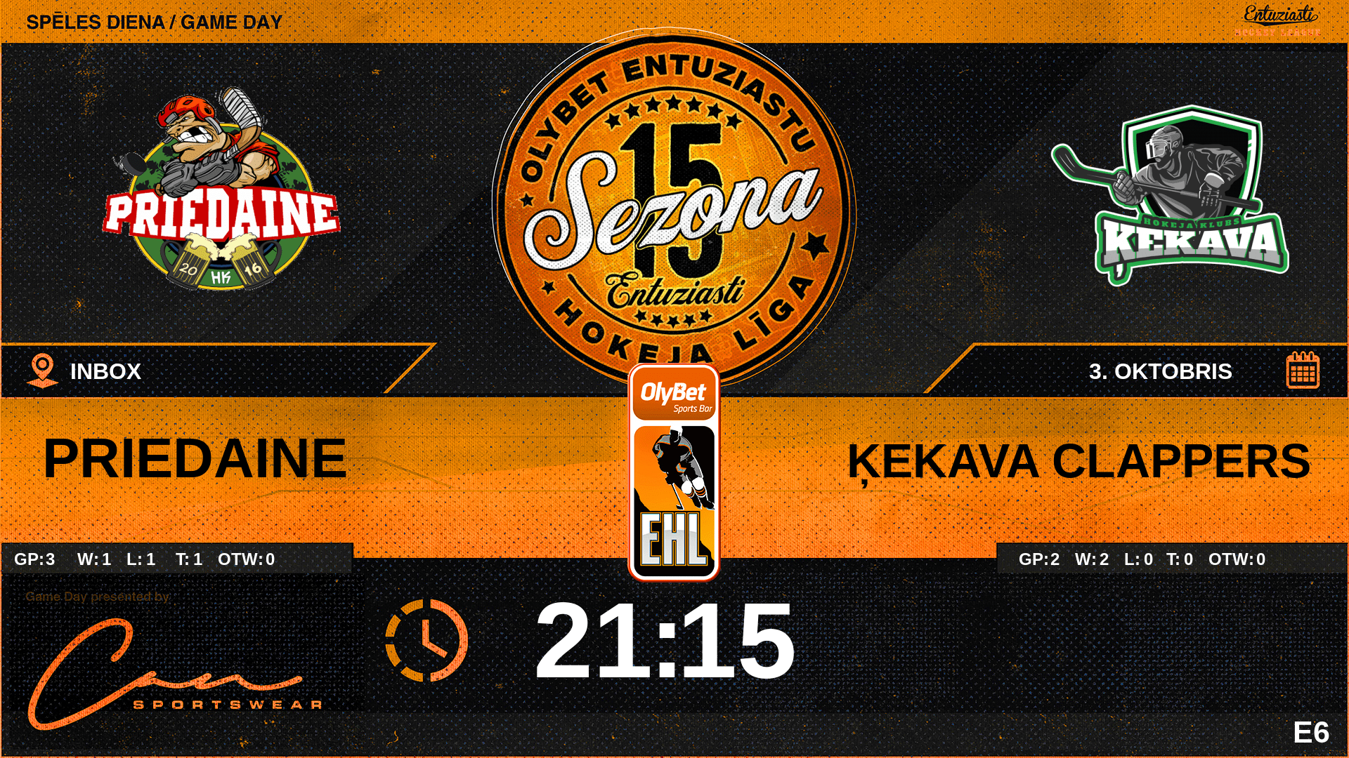 15:00 | ĶE2 | Vārti (EQ) | #16 Trevor Scotti, piespēles: #28 Matīss Gulbis |