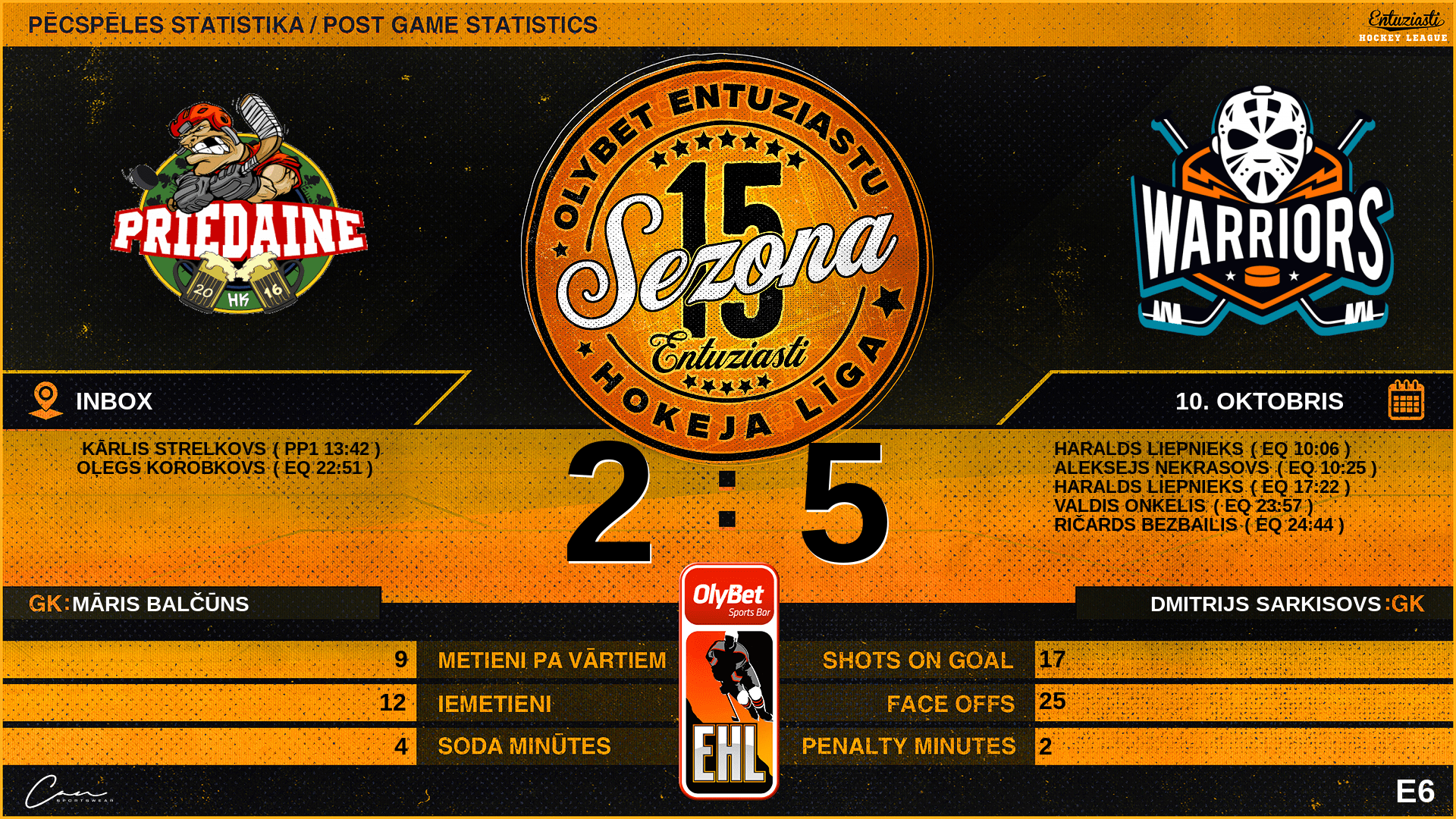 | 10:25 | WRS | Vārti (EQ) | #10 Aleksejs Ņekrasovs, piespēles: #93 Haralds Liepnieks, #55 Armands Asniņš |