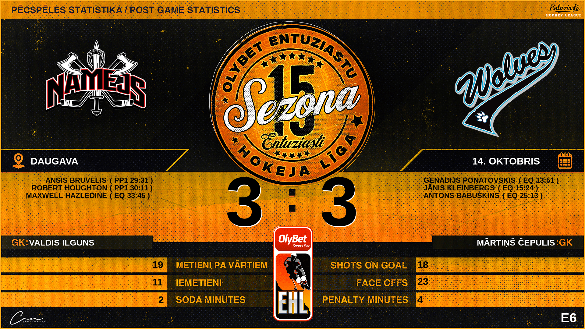 | 15:24 | WF3 | Vārti (EQ) | #21 Jānis Plūme, piespēles: #7 Jānis Kleinbergs |