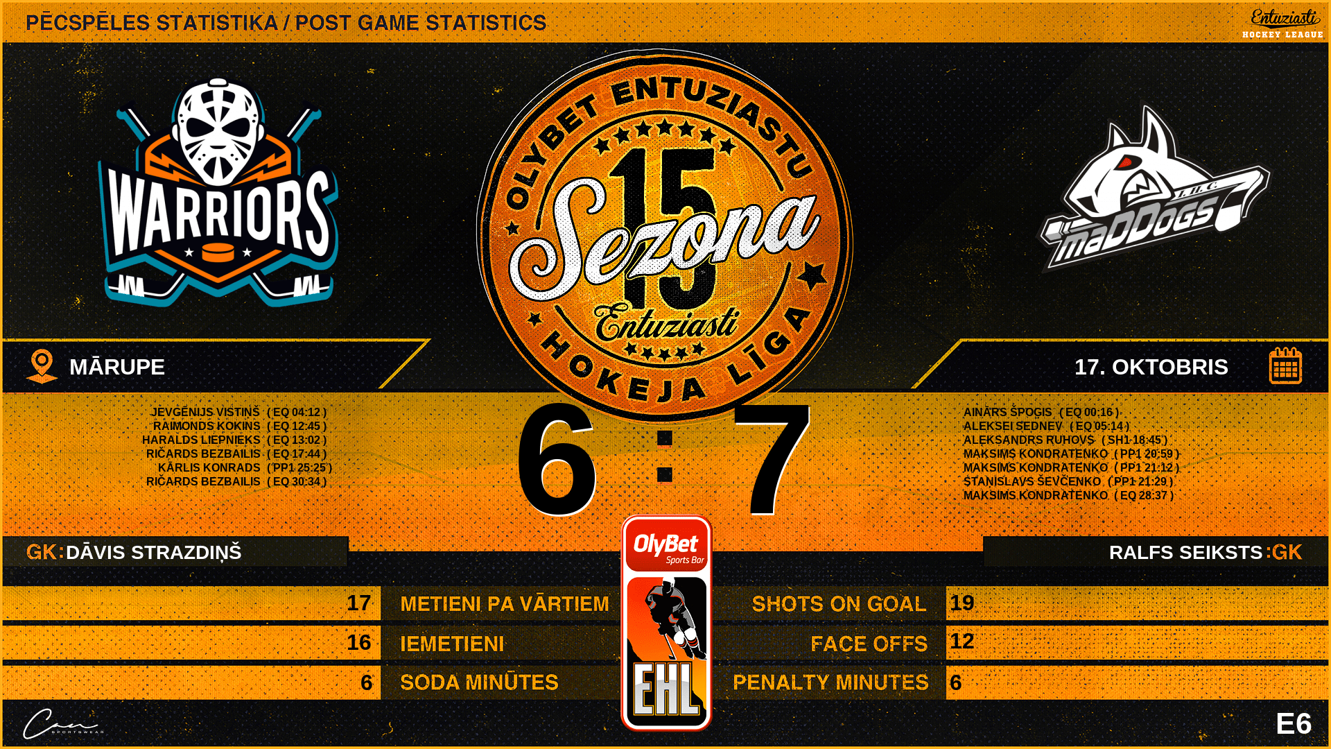| 04:12 | WRS | Vārti (EQ) | #66 Jevgēnijs Vistiņš, piespēles: #13 Ričards Bezbailis, #9 Edgars Zeidlers |