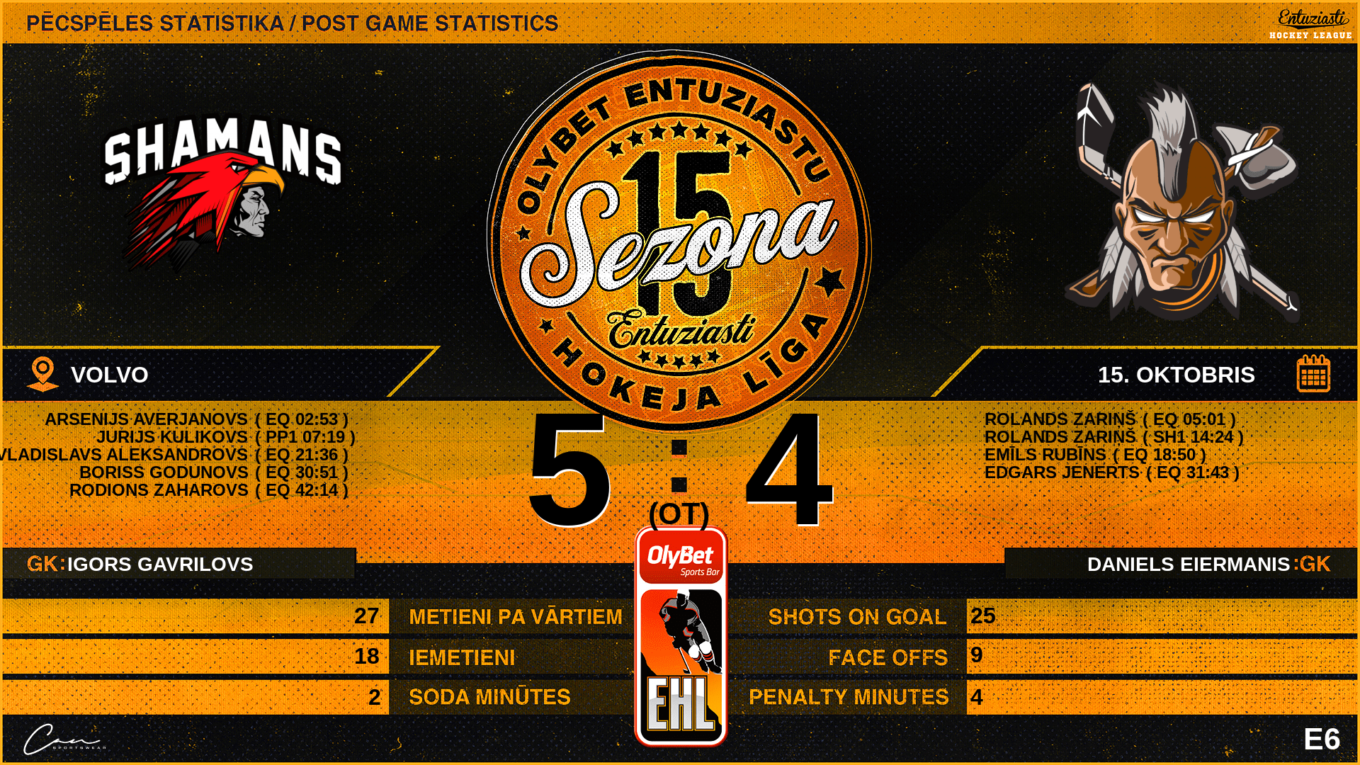 | 30:51 | SHM | Vārti (EQ) | #17 Boriss Godunovs, piespēles: #95 Arsenijs Averjanovs, #26 Igors Smilgins |