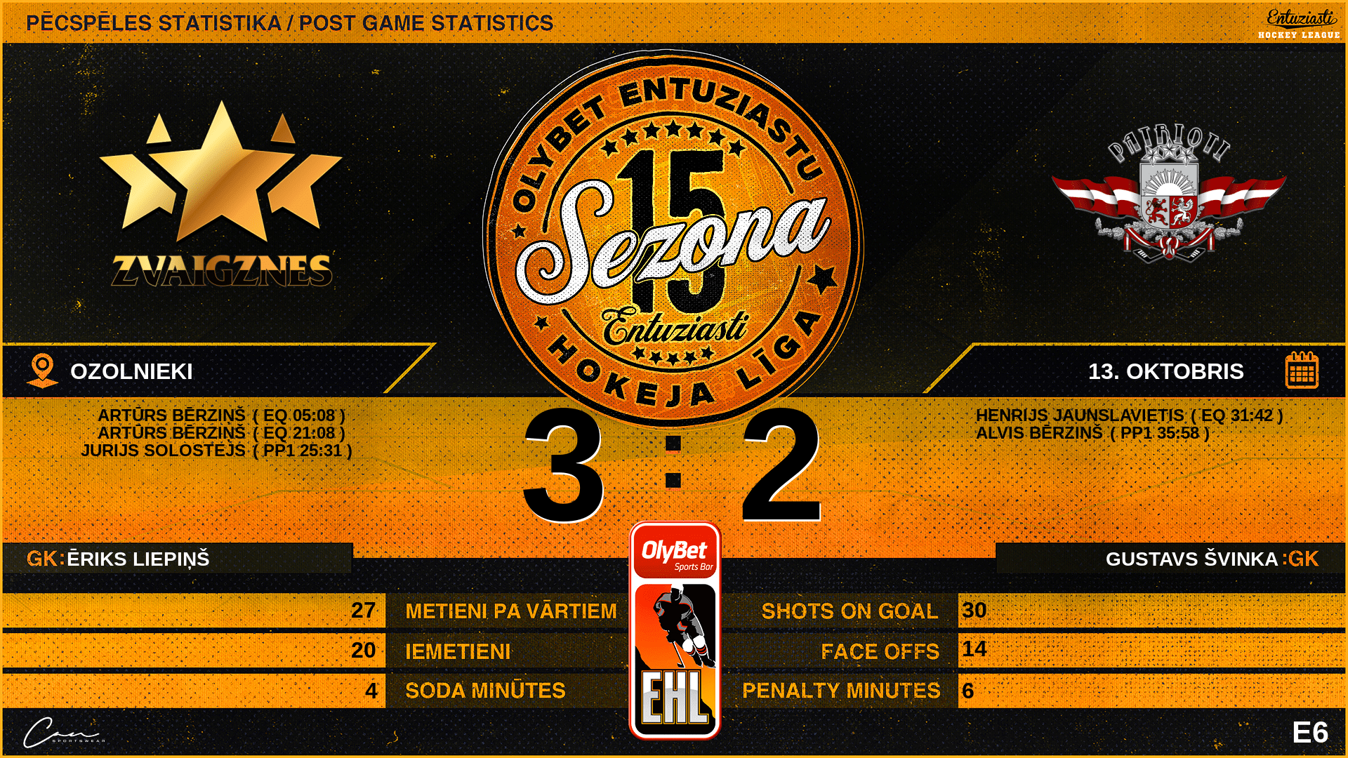 | 25:31 | LAS | Vārti (PP1) | #10 Jurijs Solostejs, piespēles: #55 Artūrs Bērziņš, #2 Gatis Gulbis |
