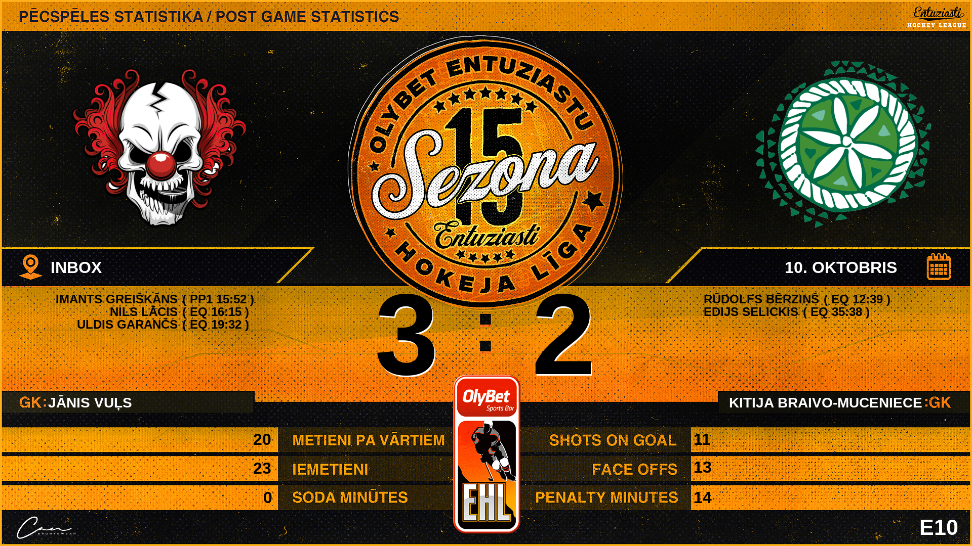 | 12:39 | PC3 | Vārti (EQ) | #87 Rūdolfs Bērziņš, piespēles: #91 Edijs Neimanis, #55 Armands Kākers |